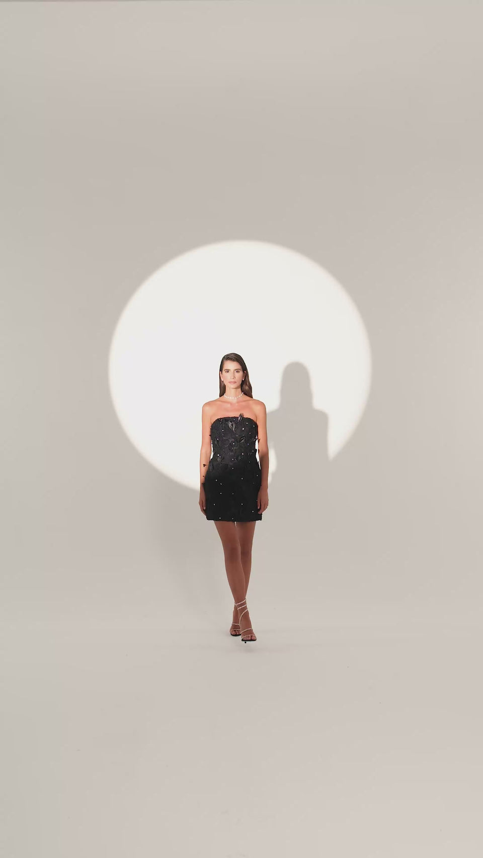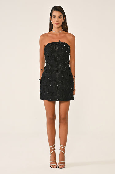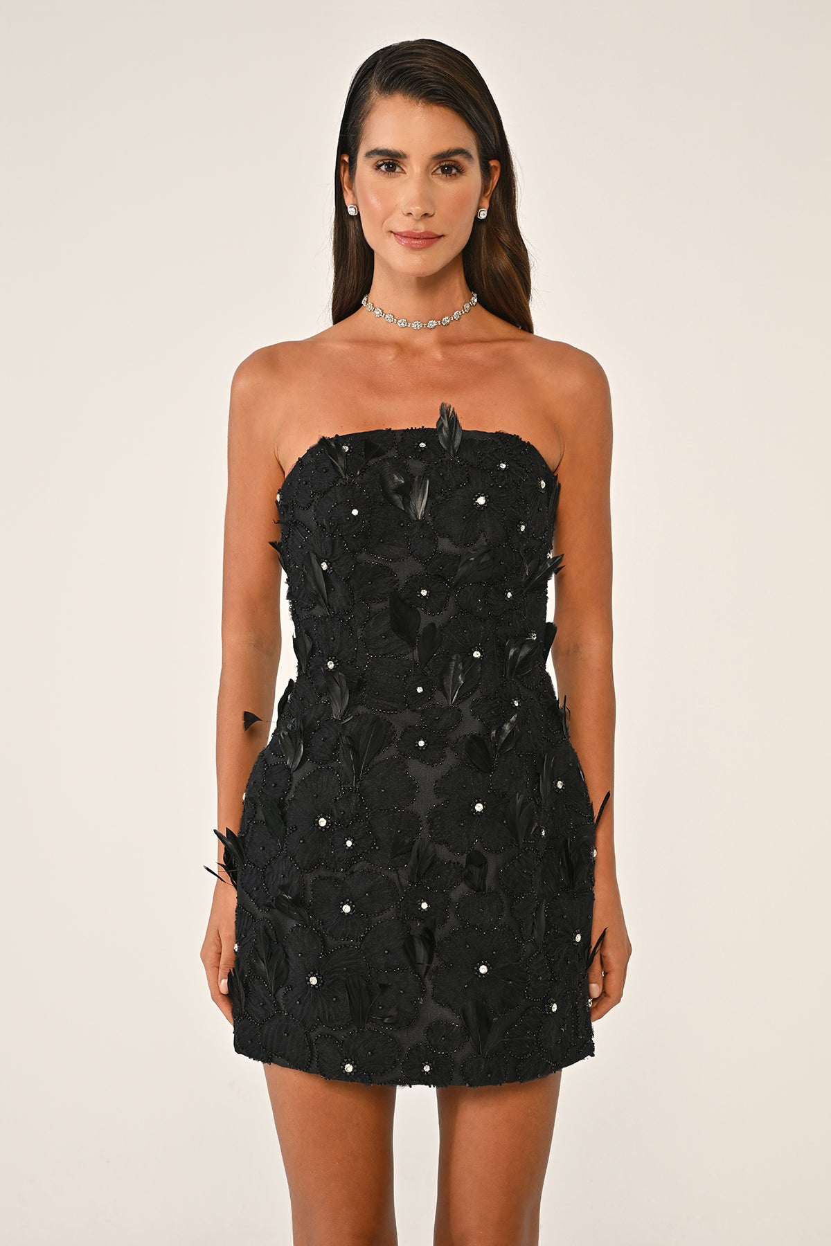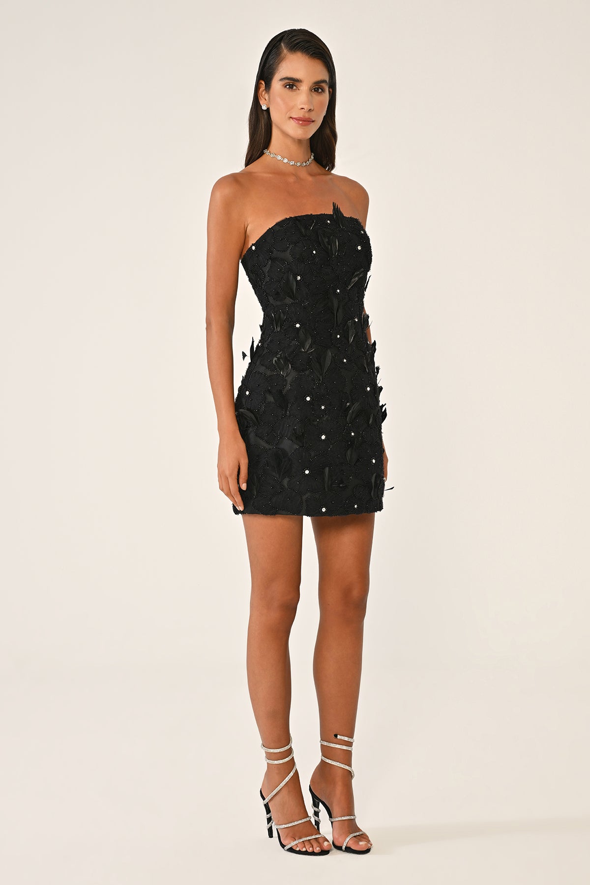 - Strapless mini dress crafted with intricate floral lace and feather embellishments
