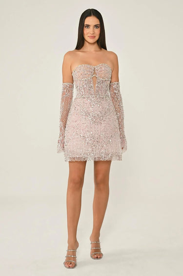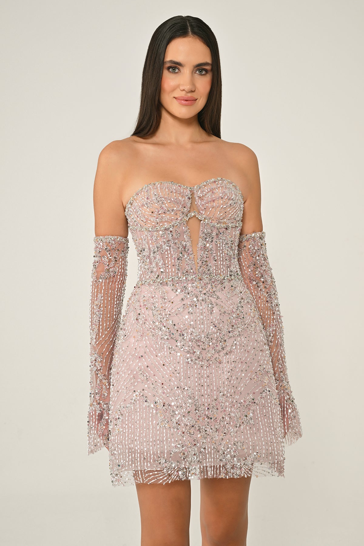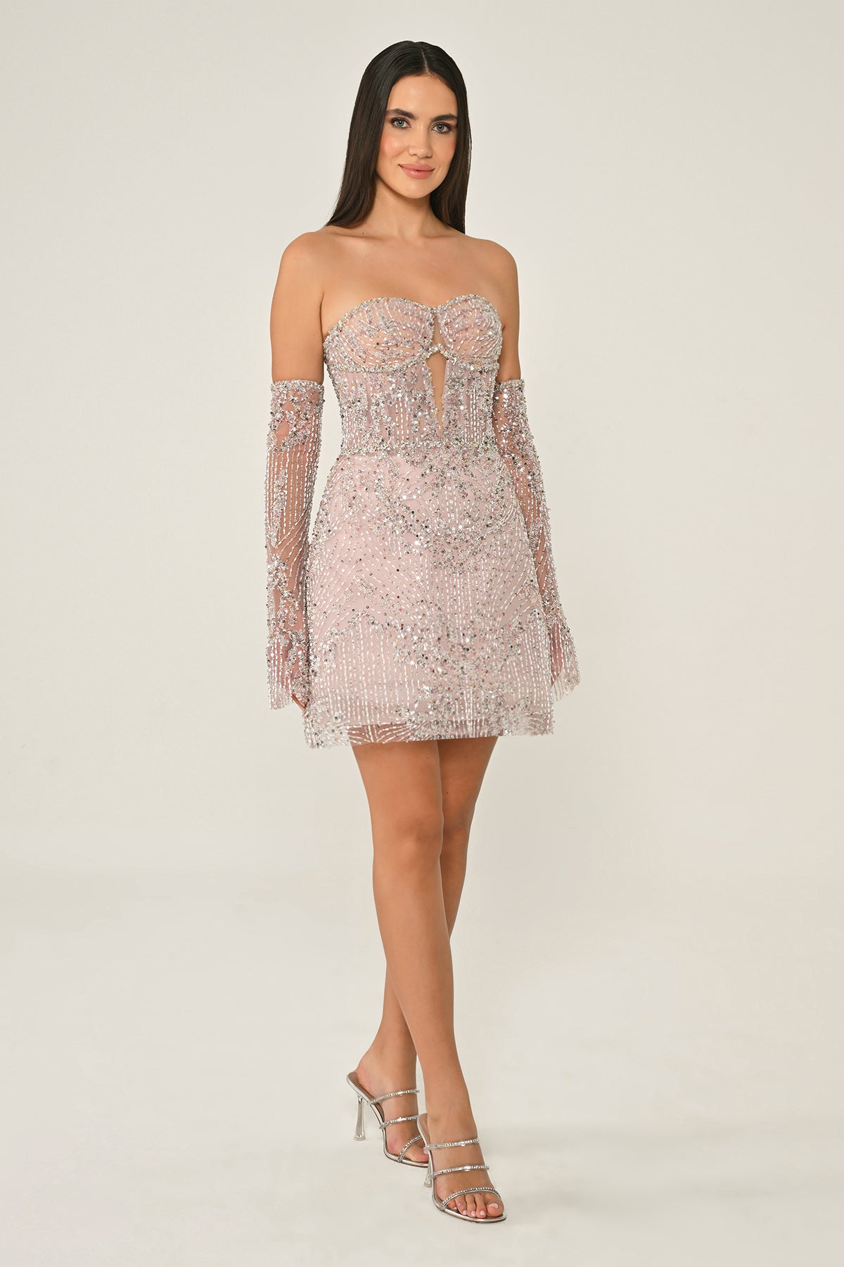 Strapless Mini Dress with Beaded Corset and Sheer Sleeves-Powder