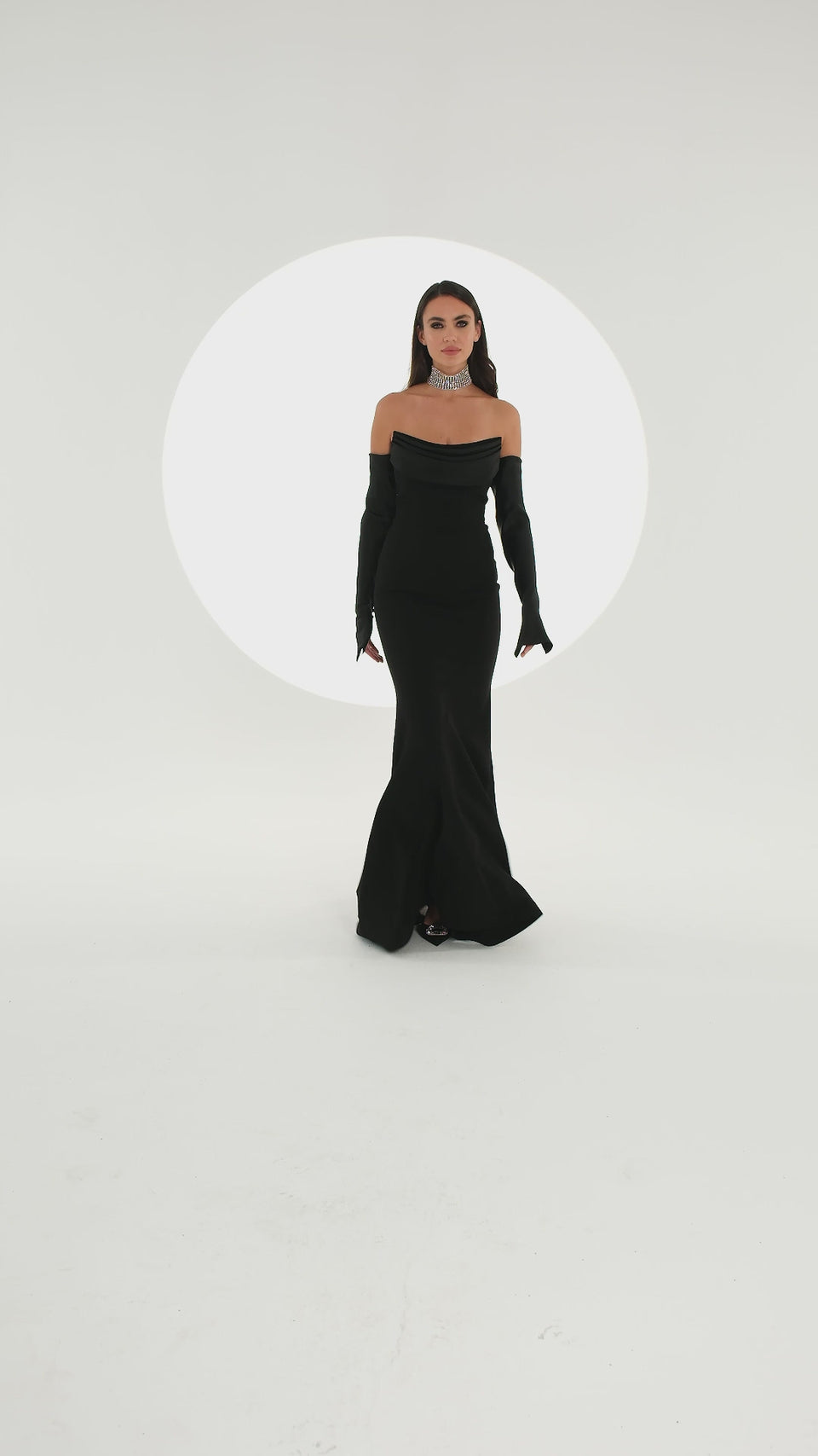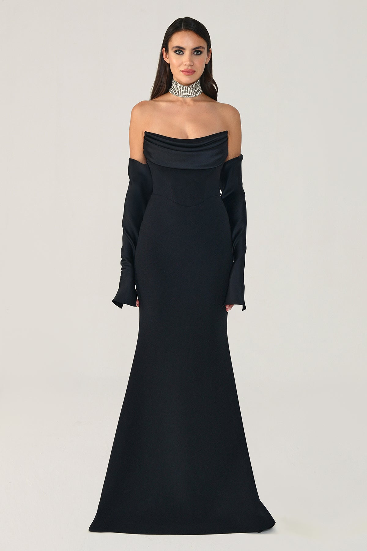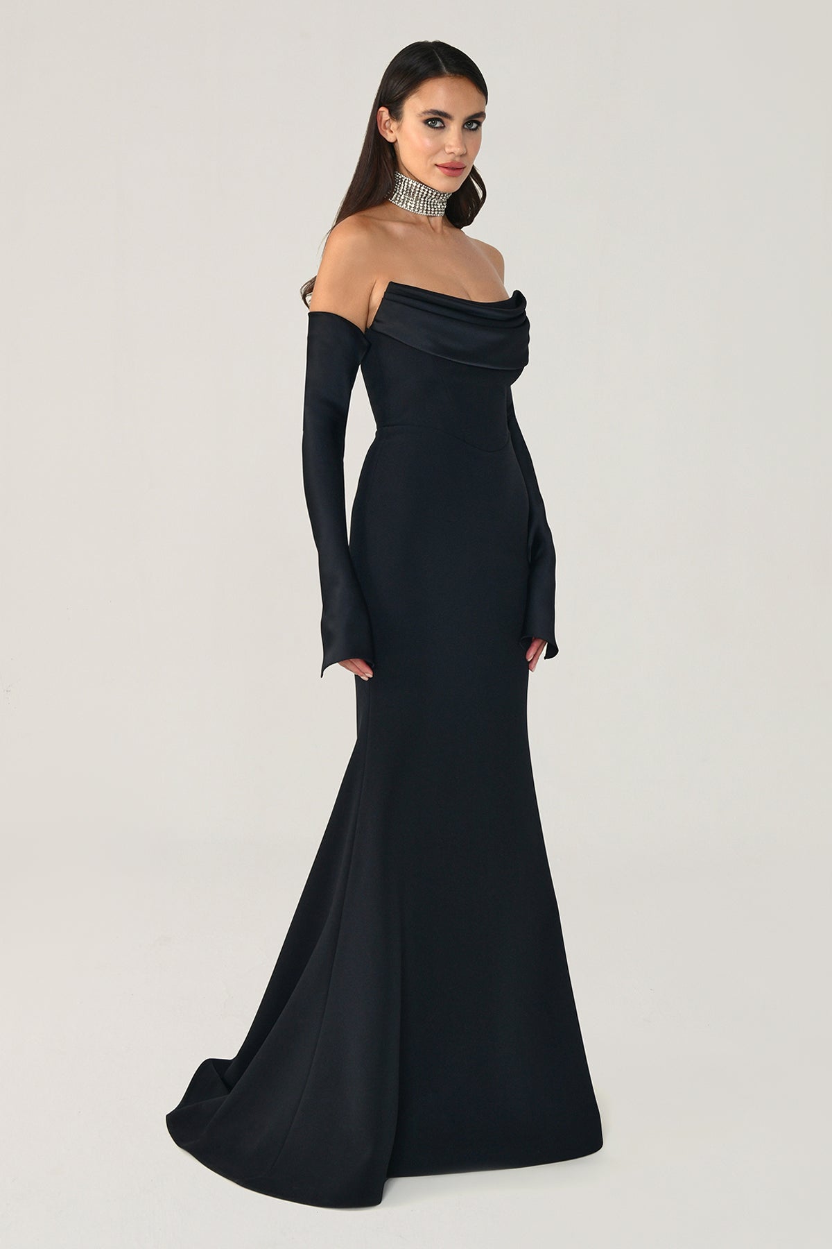 Black Off-Shoulder Satin Panel Evening Dress