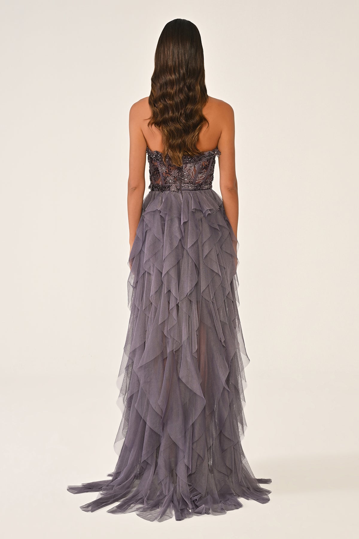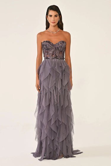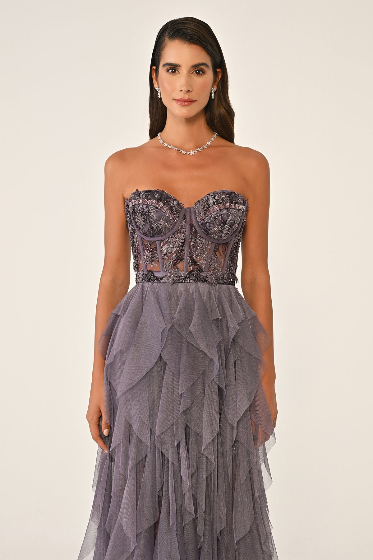 Strapless Beaded Corset Gown with Layered Tulle Skirt