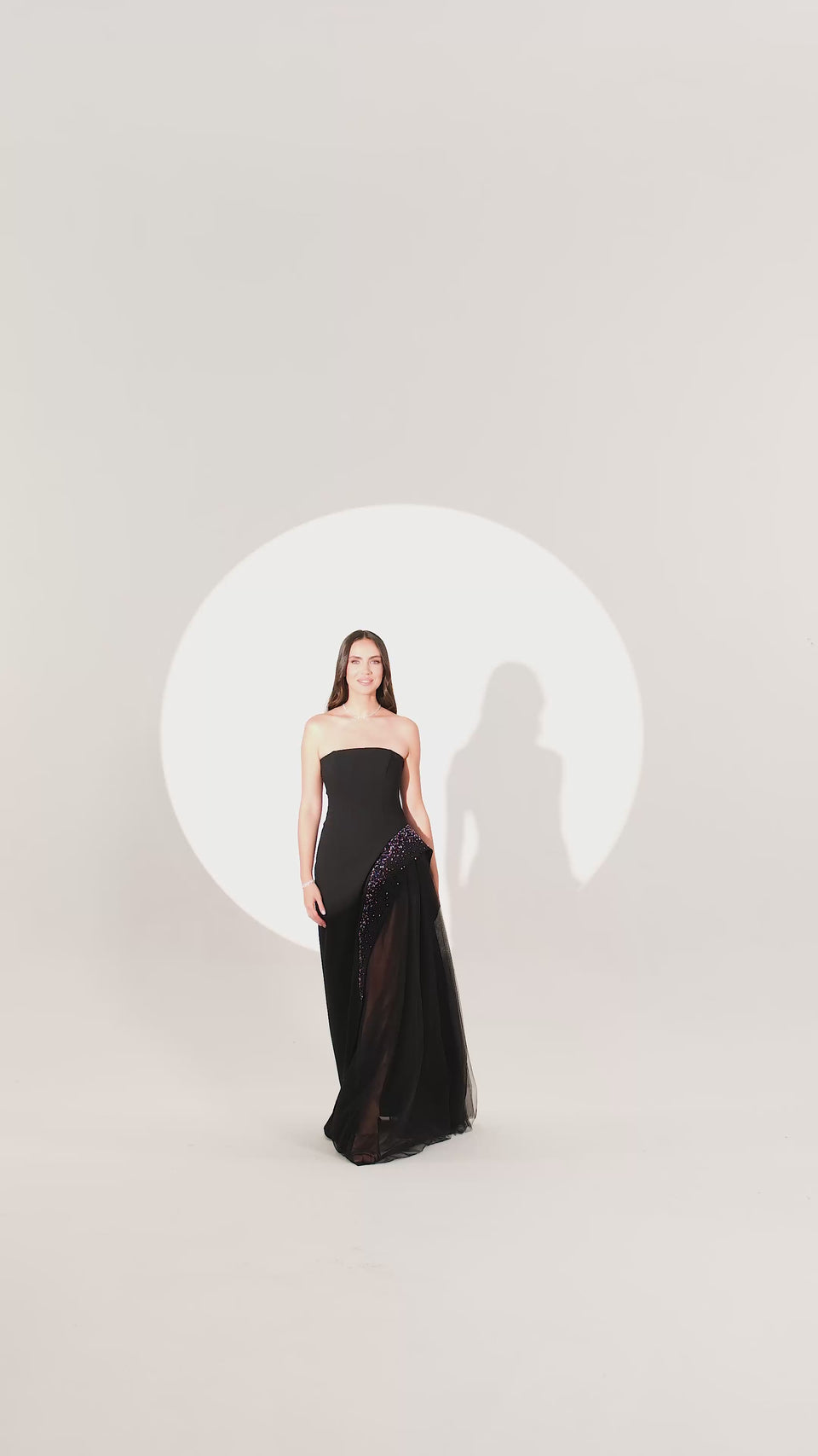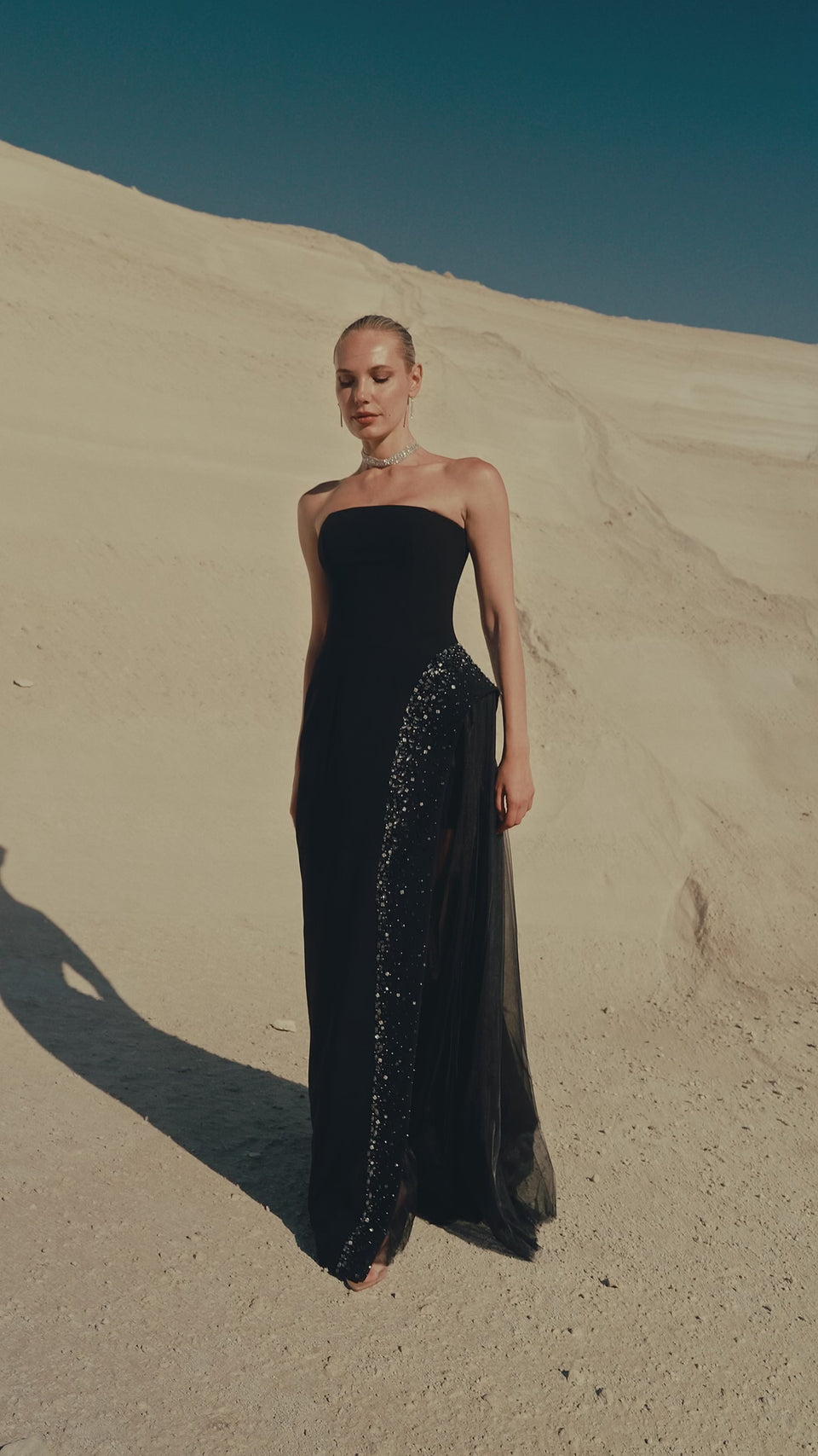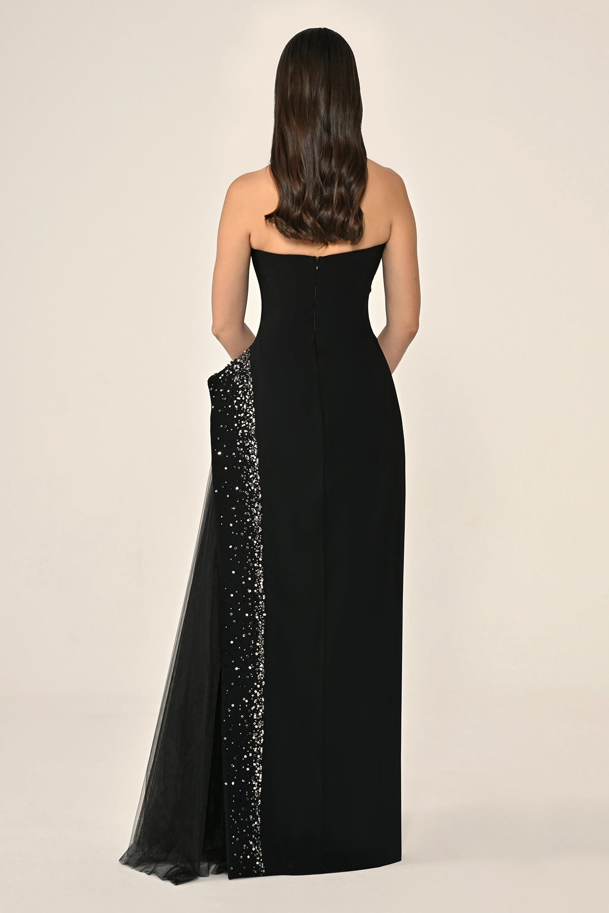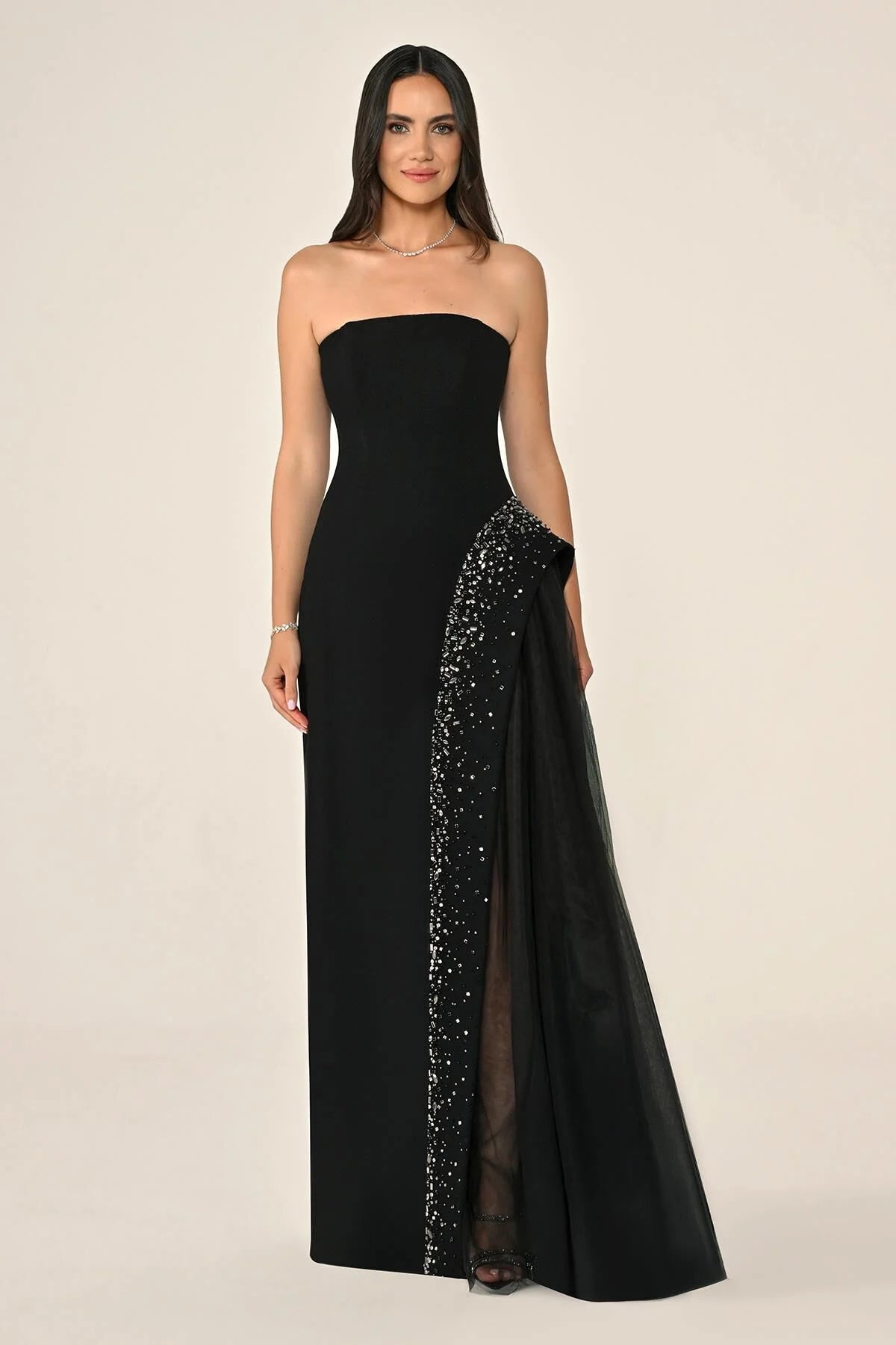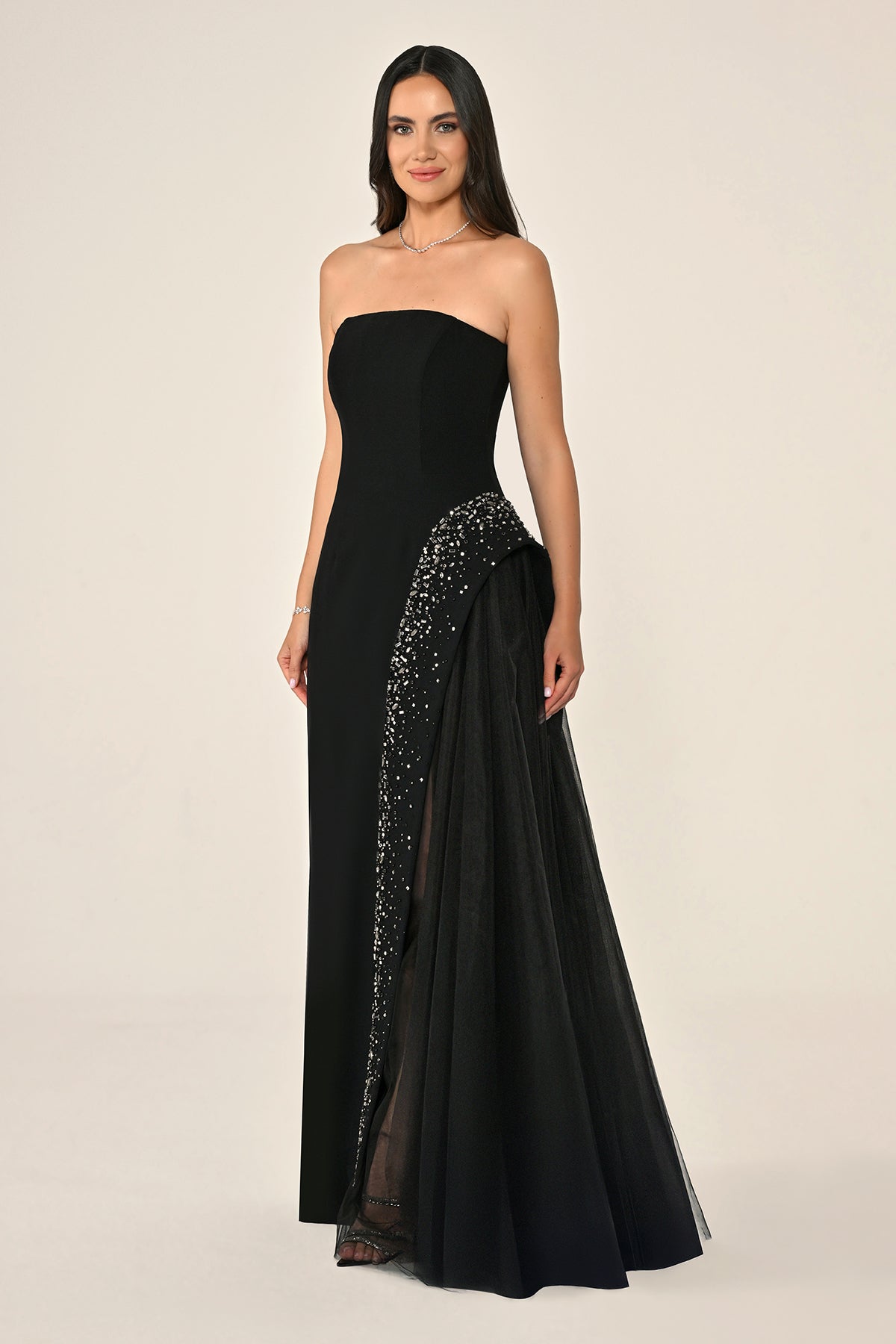 Strapless Black Maxi Dress with Sequin Draped Detail