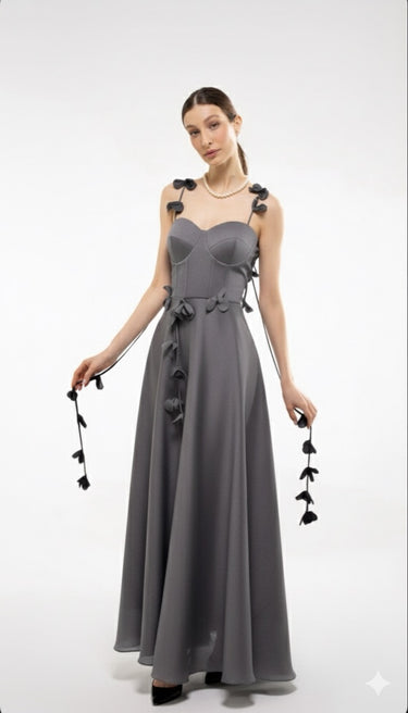This elegant long grey gown embodies feminine grace with its structured bustier-style bodice and flowing A-line silhouette. The shoulder and waistline are adorned with delicate bow appliqués that cascade down, adding a romantic and whimsical touch. Perfect for evening events, weddings, or special occasions, this design balances sophistication with playful detailing.