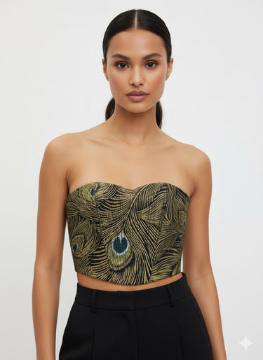 This peacock-feather jacquard corset top is a true statement piece that radiates elegance and artistry. Designed with a strapless sweetheart neckline and a structured fit, it beautifully contours the body while showcasing an intricate peacock feather pattern in shades of emerald, gold, and midnight blue. Perfect for evening events, art-inspired looks, or sophisticated pairings with high-waisted pants or skirts.