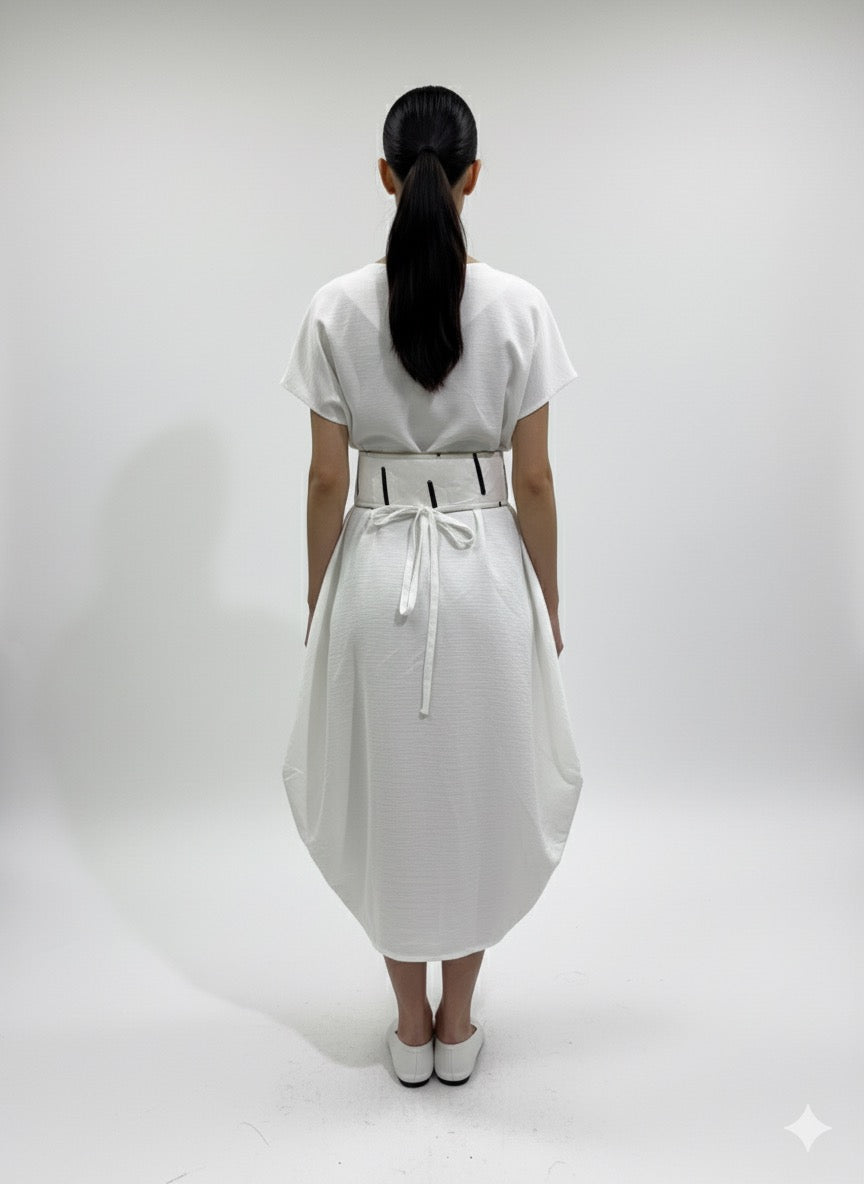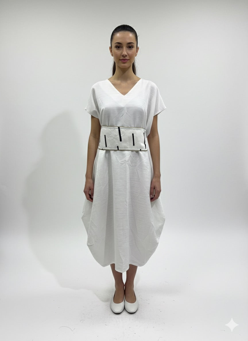 This elegant white midi dress features a minimalist silhouette with a V-neckline and short sleeves. The voluminous draped skirt flows effortlessly, giving the design a contemporary edge. The look is elevated with a wide structured waistband in white, accented by vertical black details that define the waistline and add a modern contrast. Perfect for both formal gatherings and chic daytime events.