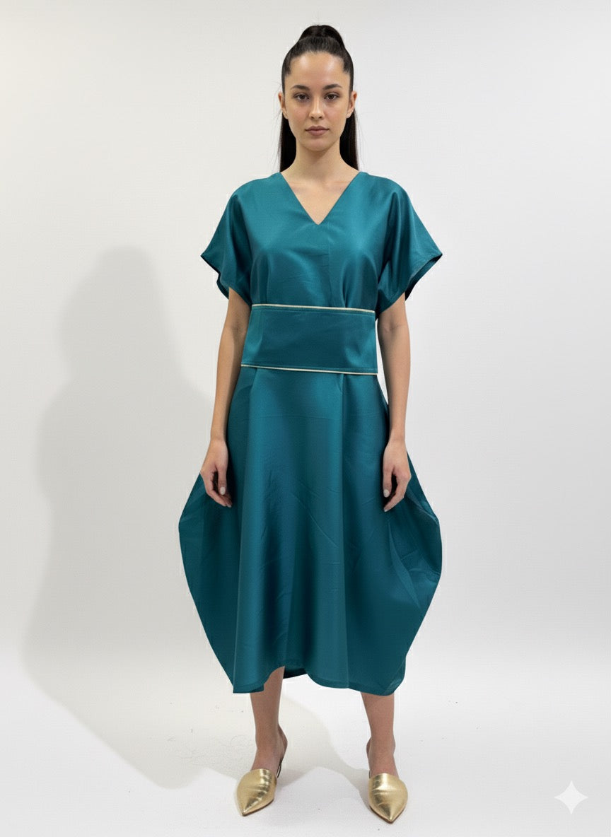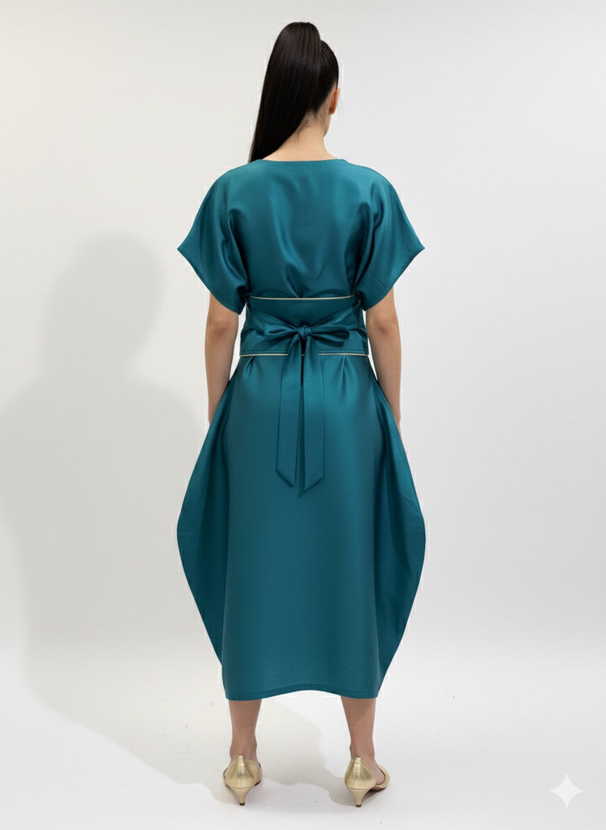 This teal satin midi dress features a relaxed silhouette with a soft V-neckline and short sleeves for a comfortable yet polished look. The wide satin waistband with subtle piping defines the waist and adds elegance, while the asymmetrical draped hemline enhances the flow and modern feel of the piece. Perfect for evening gatherings or daytime chic occasions.