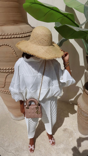 This white geometric textured blouse offers a luxurious yet relaxed look, perfect for summer sophistication. Featuring an oversized silhouette with structured kimono sleeves and a soft draped collar, it’s crafted from a lightweight pleated fabric with elegant linear patterns that catch the light beautifully. The airy design allows for versatile styling — ideal for both resort wear and city chic looks.