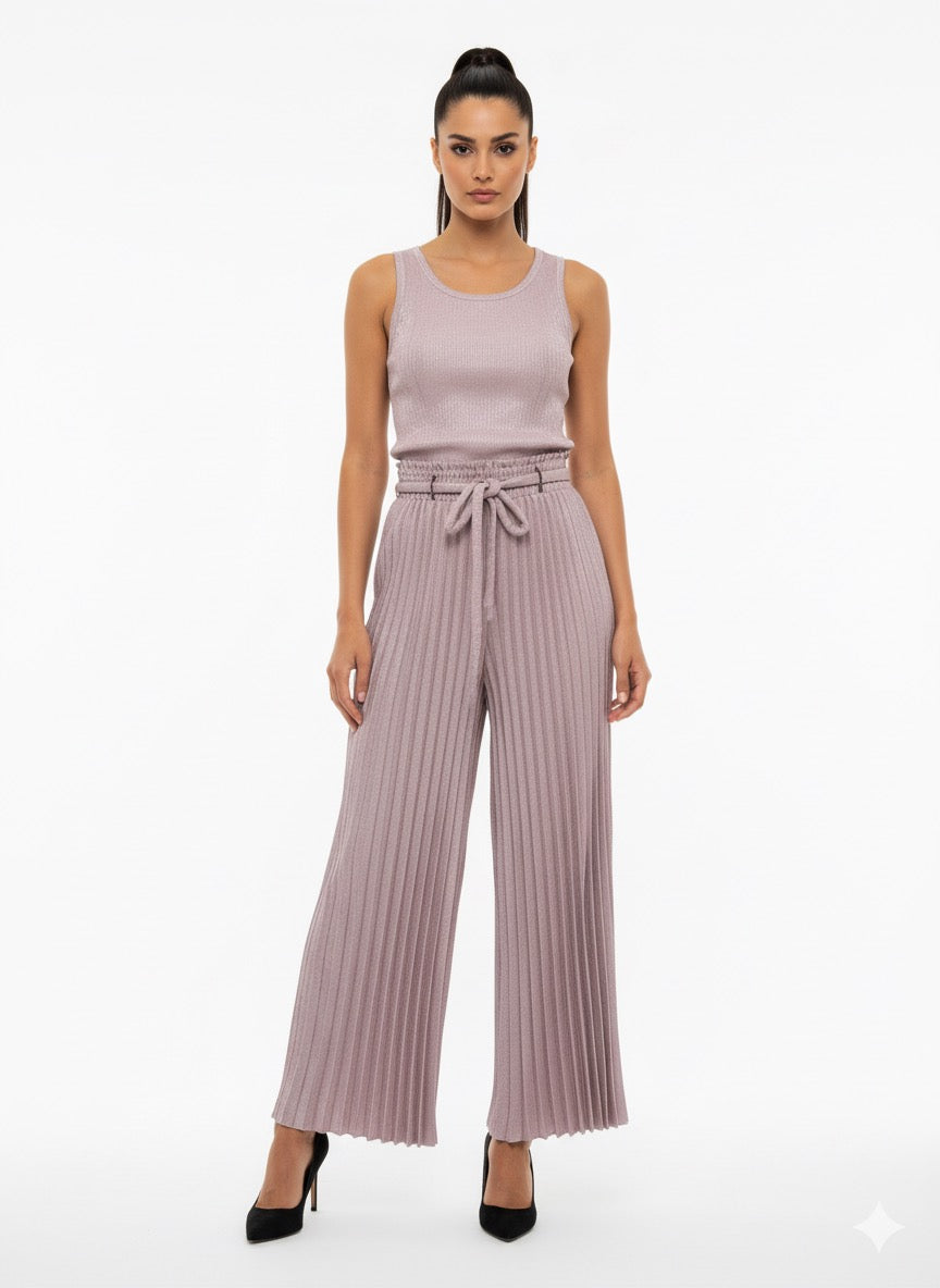 These ribbed knit pants in a soft mauve tone combine comfort and elegance with a modern twist. Designed with a high elastic waistband and an adjustable drawstring, they offer both structure and flexibility. The wide-leg silhouette and vertical ribbed texture elongate the figure, making them ideal for both casual and chic occasions.