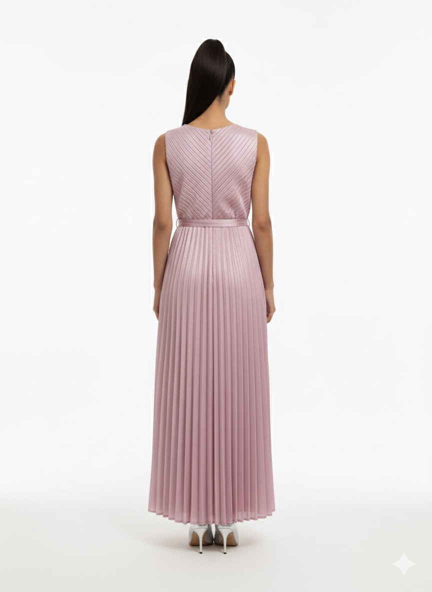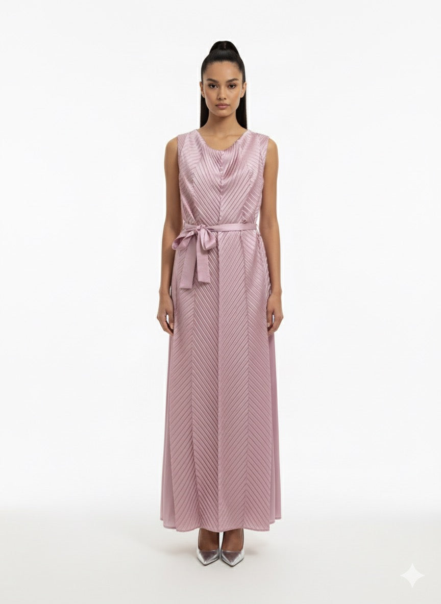 Linear Pleated Betlted Dress Pink