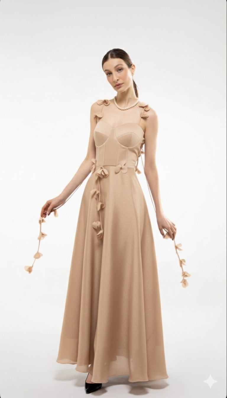 This elegant beige maxi dress features a structured bodice with defined cup detailing that accentuates the feminine silhouette. The shoulder and waistline are delicately adorned with soft 3D floral appliqués, adding a romantic and graceful touch. The flowing A-line skirt moves beautifully with every step, making it ideal for evening events or special occasions.