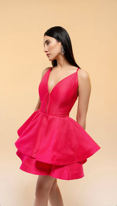 This captivating fuchsia mini dress features a plunging V-neckline with delicate tie detailing and adjustable thin straps. The double-layered peplum skirt adds dramatic volume and movement, creating a bold yet feminine silhouette. Crafted from a structured fabric with a subtle sheen, this piece is perfect for cocktail parties or elegant evening events.
