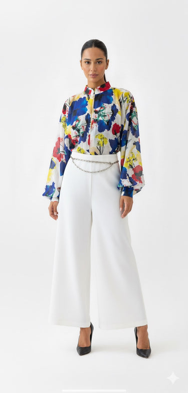 These elegant wide-leg white pants feature a high-waisted design that elongates the figure while offering a sophisticated silhouette. The soft drape of the fabric provides fluid movement, making them a perfect choice for both day and evening wear. Finished with a clean hemline and a minimal waistband, these trousers can easily be styled with printed blouses or fitted tops for a refined and modern look.