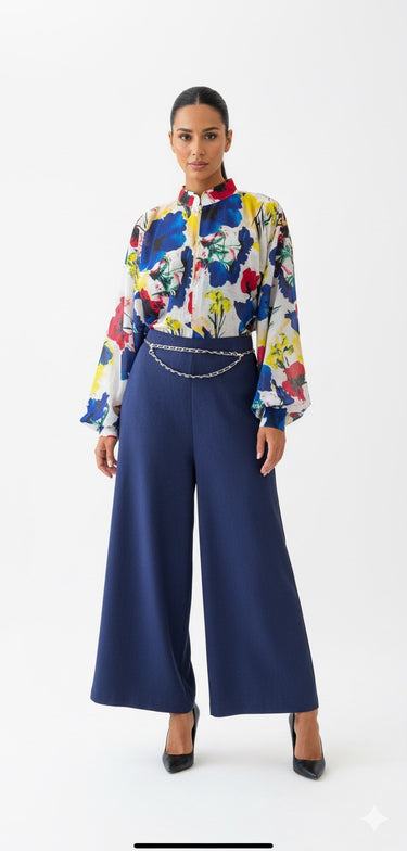 These elegant navy wide-leg pants feature a high-waisted silhouette that elongates the figure and adds a touch of sophistication. The structured yet fluid drape ensures a flattering fit, while the soft woven fabric offers all-day comfort. Finished with a subtle texture and paired perfectly with blouses or fitted tops, these pants transition seamlessly from office wear to evening looks.