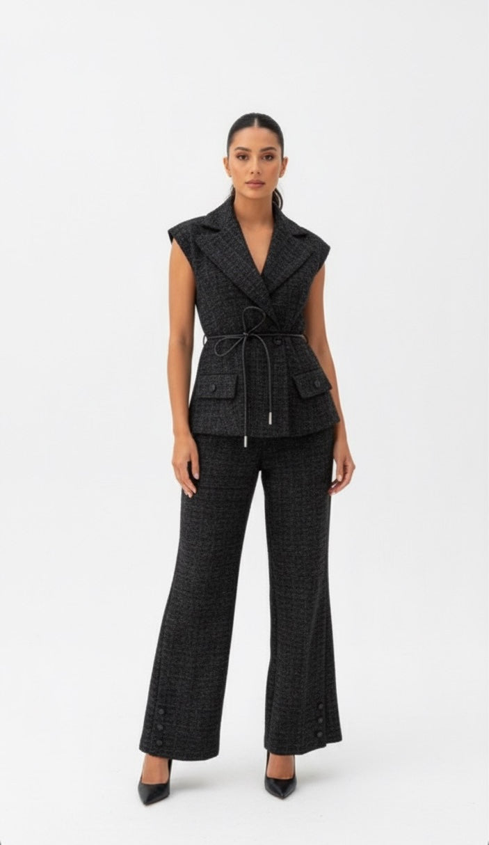 A modern take on timeless tailoring, this charcoal tweed set redefines contemporary elegance. The sleeveless double-breasted vest features a sharp lapel collar, structured silhouette, and adjustable belt that cinches at the waist for a flattering fit. Paired with matching flared trousers detailed with button accents at the hem, this coordinated ensemble blends classic sophistication with effortless versatility. Perfect for office-chic days or elevated evening looks, it’s a power set that exudes confidence and refined style.