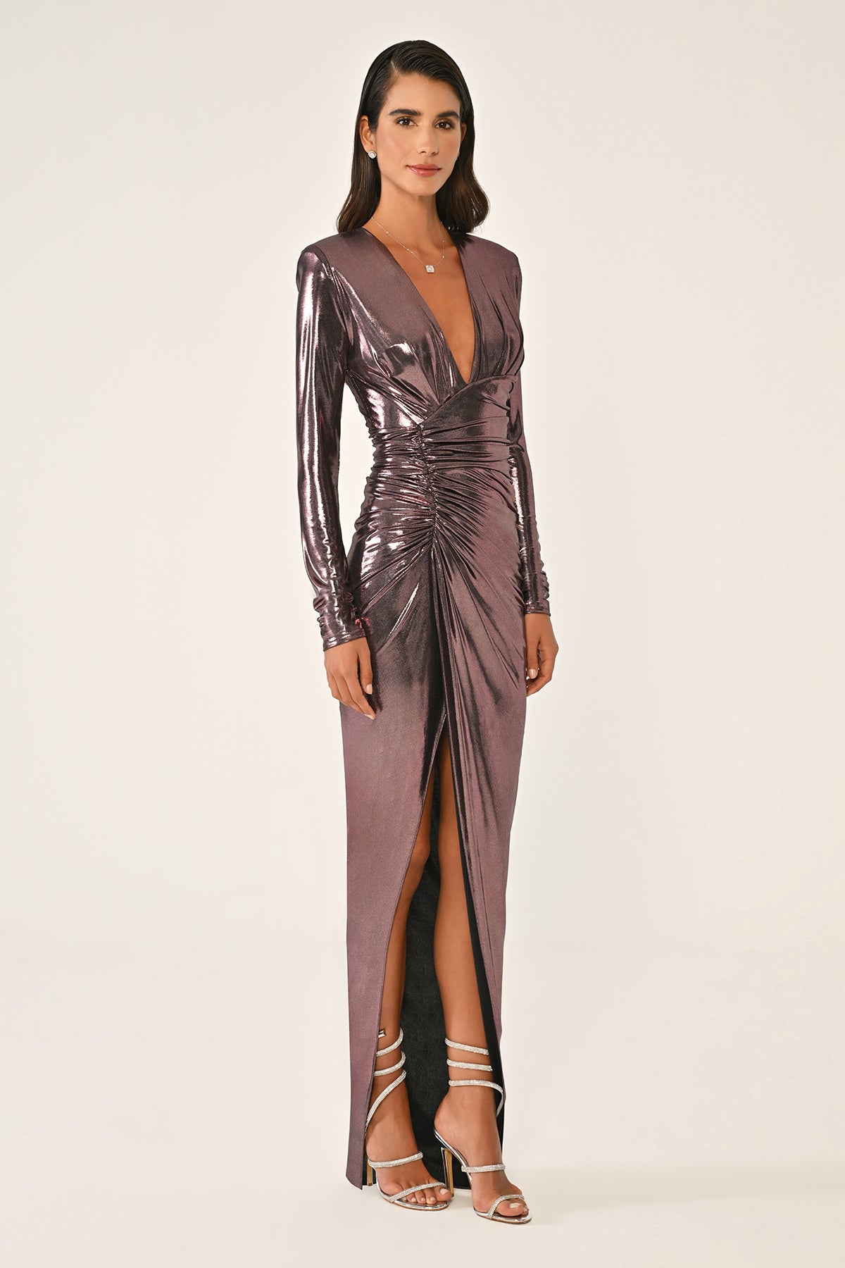 - Metallic bodycon maxi dress with a striking high-shine finish