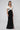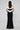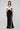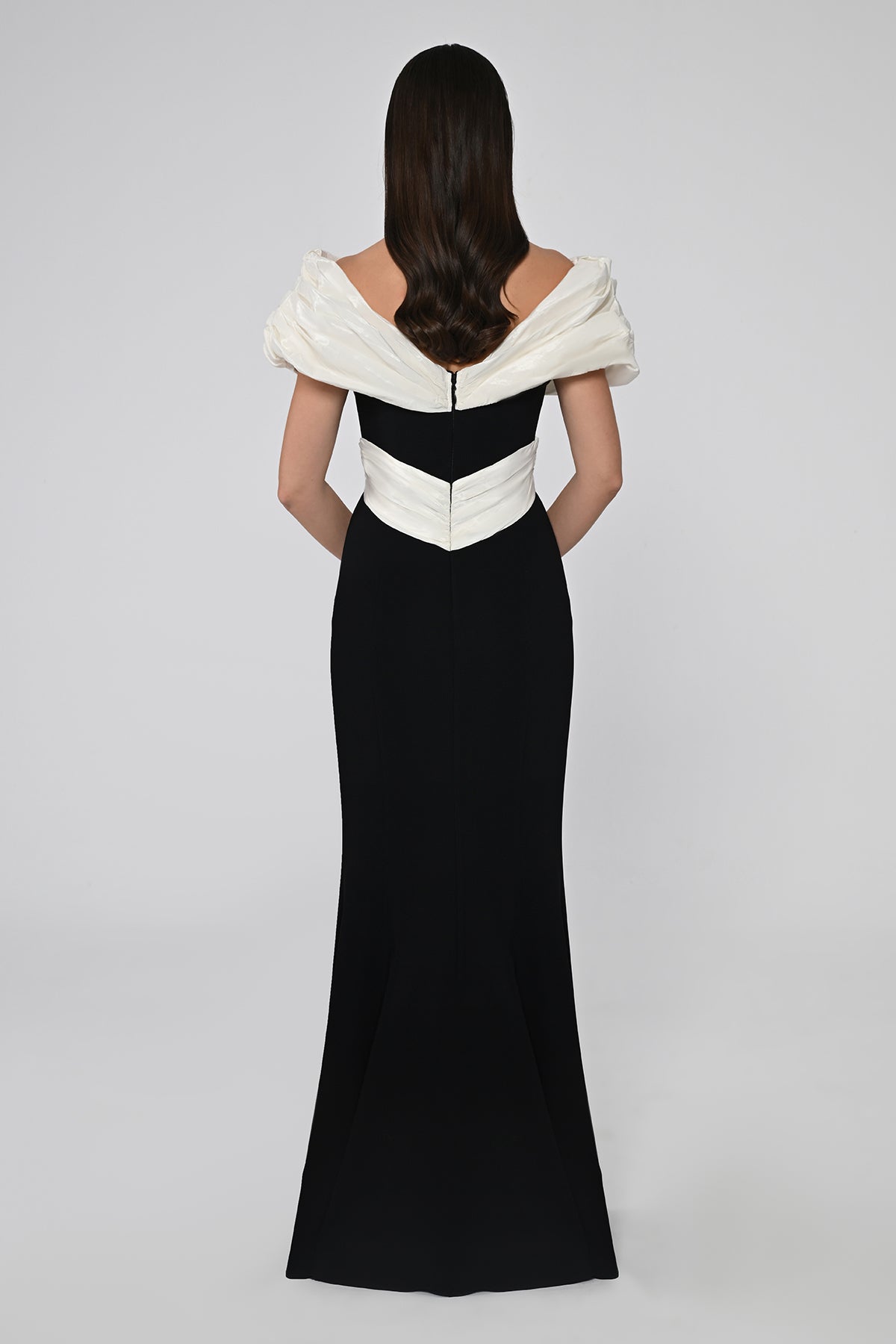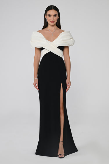 • Sophisticated black evening gown with white off-shoulder draped detailing
