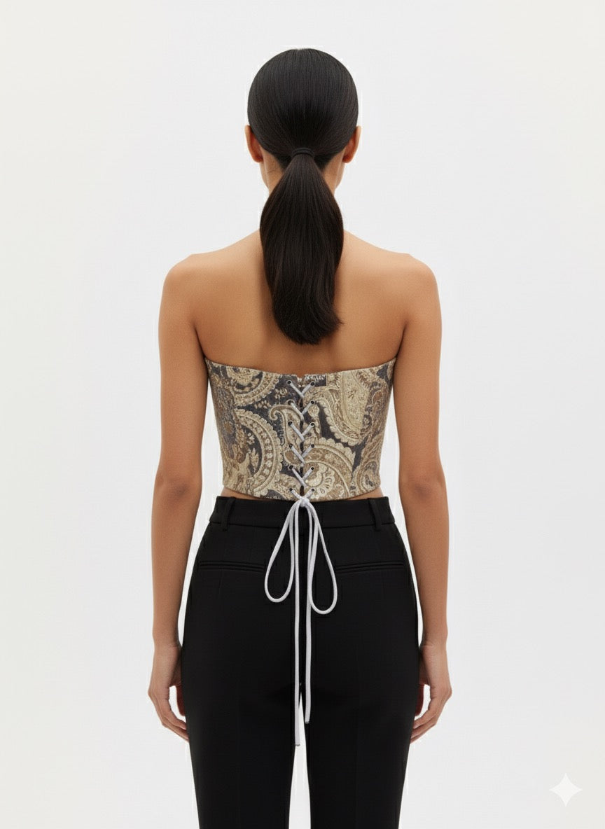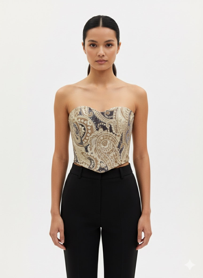 - Strapless corset crafted from authentic Termeh fabric in elegant champagne tones with intricate paisley motifs