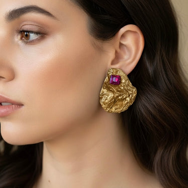 These earrings embody refined artistry with a bold yet feminine touch. Each piece is hand-sculpted in a rich gold-tone finish, revealing a natural, uneven texture reminiscent of molten metal. A striking fuchsia gemstone accent adds a pop of color and contemporary glamour, making these earrings a perfect statement accessory for sophisticated evening wear or art-inspired looks.