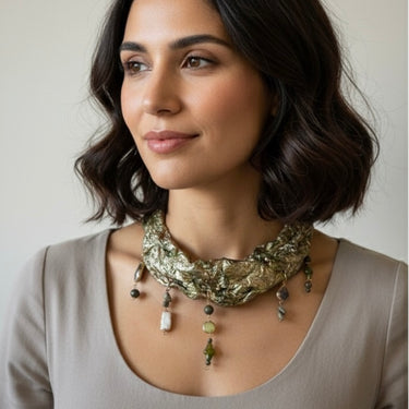 A stunning fusion of art and elegance, this gold sculptural choker features a textured metallic form that wraps gracefully around the neck. Adorned with hanging natural gemstones and handcrafted details, it brings together the beauty of raw artistry with luxurious sophistication. Perfect for evening wear or adding a bold statement to minimalist outfits.