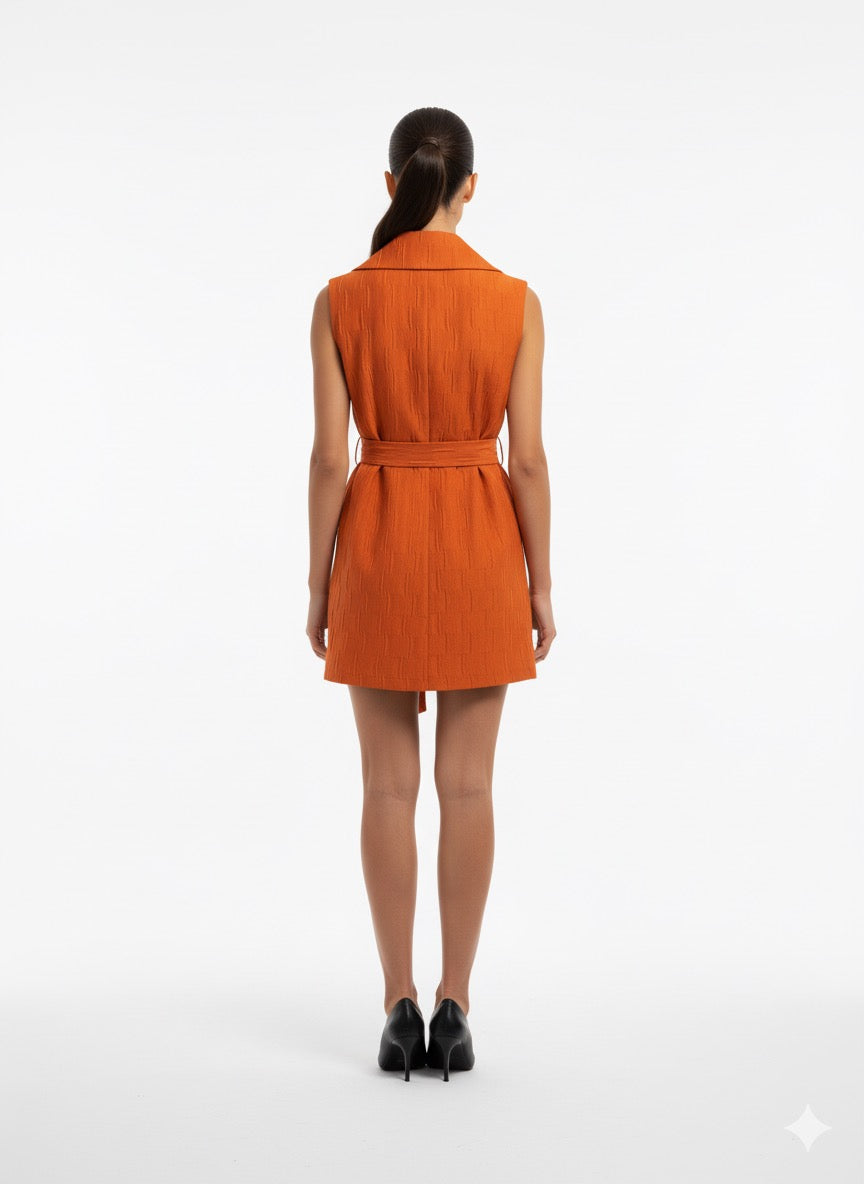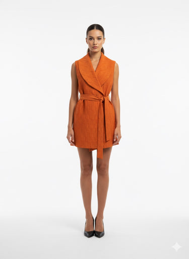 This sophisticated sleeveless wrap dress features a textured crêpe fabric that enhances structure while maintaining fluidity. The wide shawl collar adds a contemporary touch, and the self-tie waist belt cinches the silhouette for a flattering, feminine fit. Perfect for both daytime chic and elegant evening occasions.
