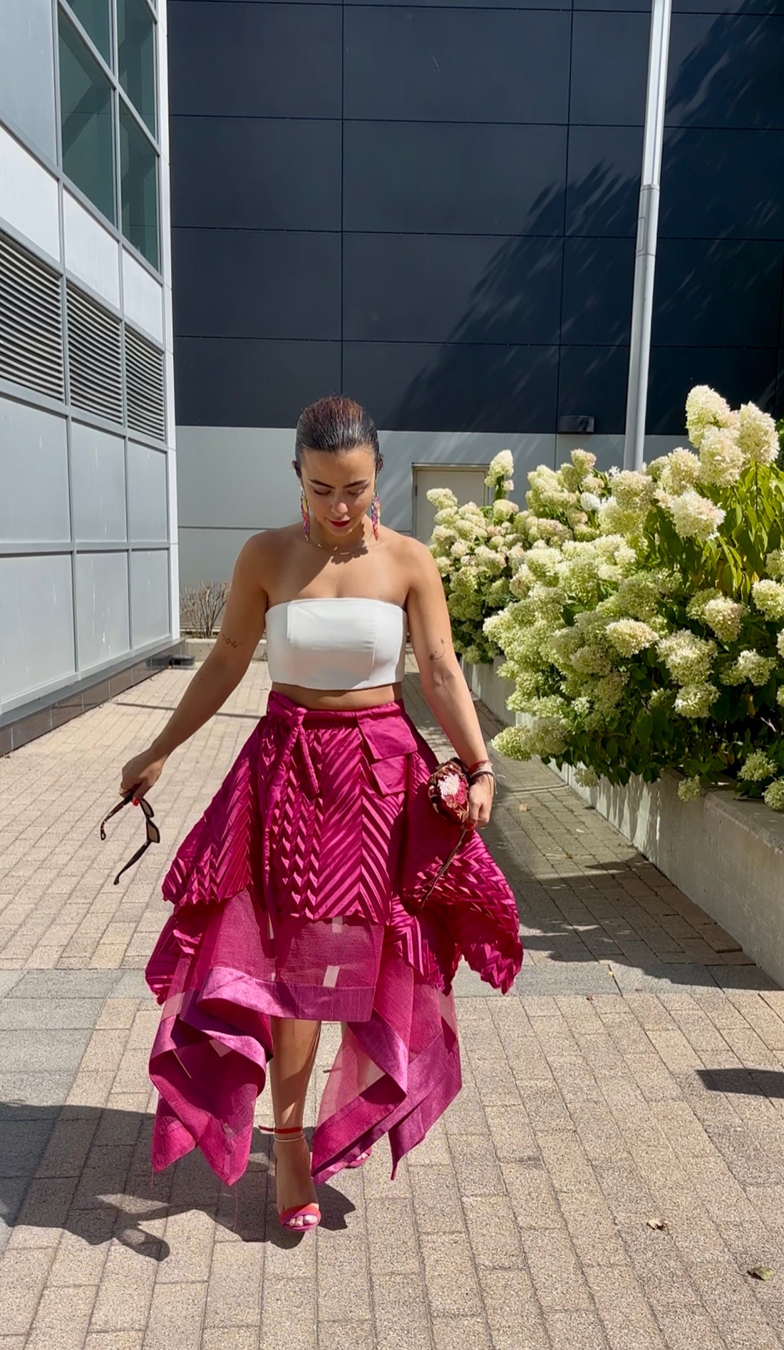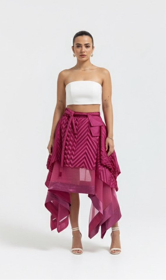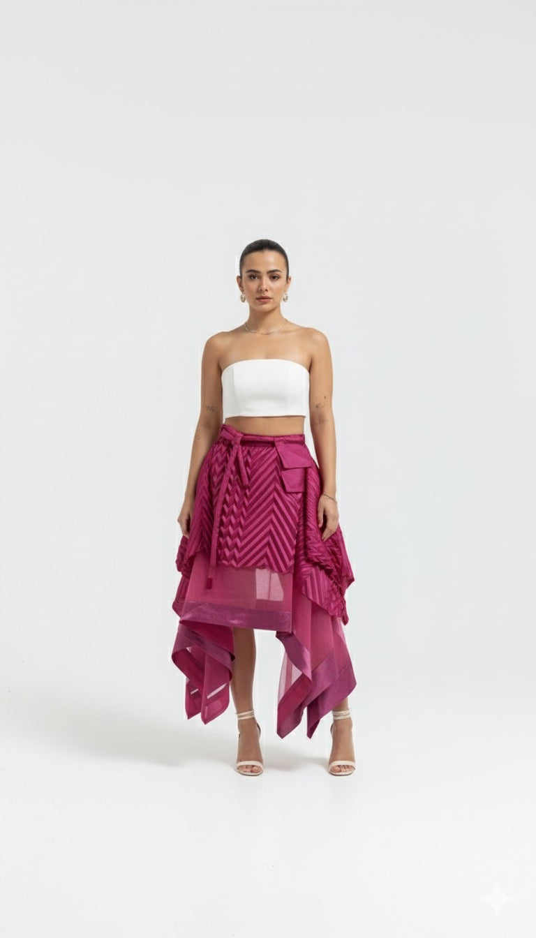 A statement asymmetric skirt designed with bold layered panels and modern texture. The fully elastic waistband ensures comfort and flexibility, while the detachable belt cinches the waist for a flattering silhouette. Practicality meets style with a discreet pocket detail, making it both fashionable and functional.