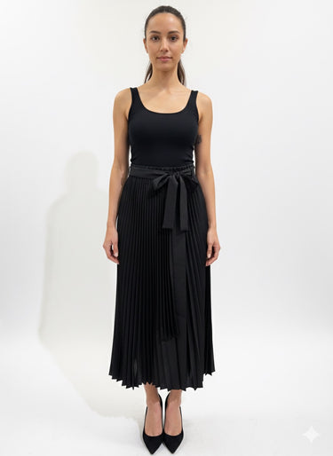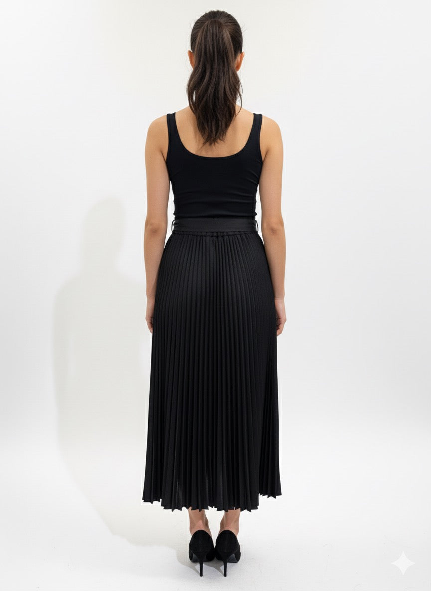 - Midi-length wave pleated skirt with asymmetrical layered design