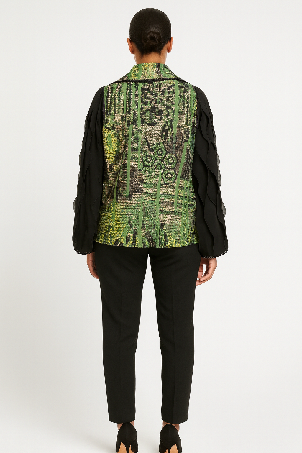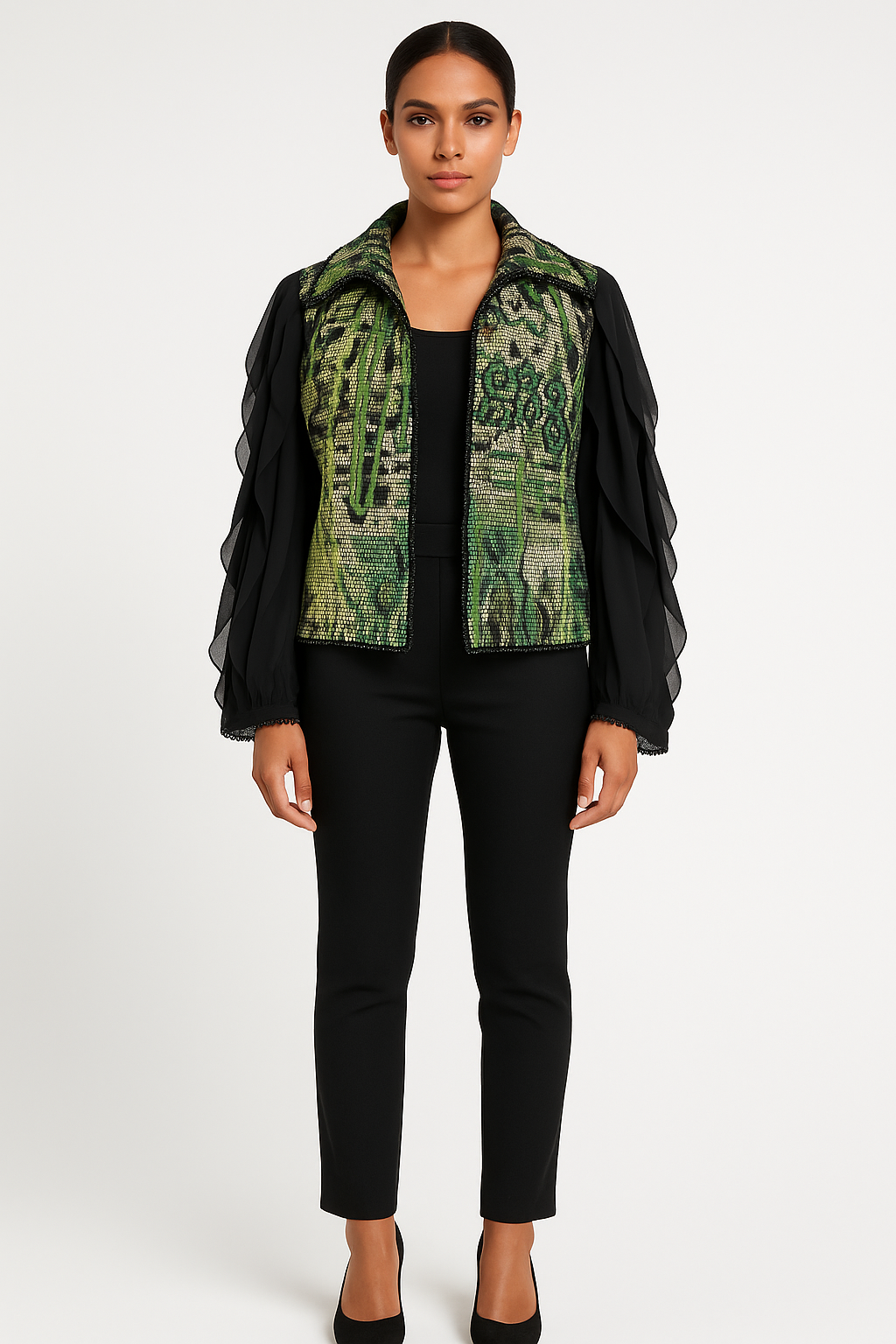 A bold statement jacket crafted from richly textured jacquard in striking green and black tones, finished with layered crepe sleeves and bead-trim accents. The intricate woven pattern creates a modern, artistic look while the flowing sleeves add movement and elegance.