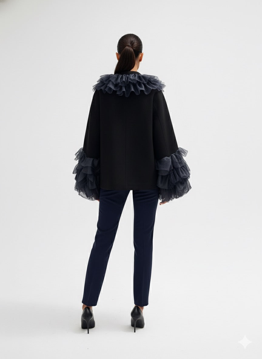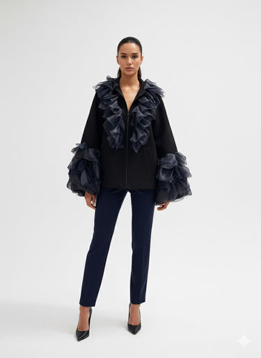 Dramatic yet refined, this black blue statement coat is a masterpiece of modern couture design. The oversized silhouette is elevated with cascading organza ruffles along the neckline and sleeves, creating a sense of movement and sculptural depth. Crafted from a structured yet soft fabric, it offers comfort while maintaining an architectural form. Perfect for evening occasions or as a show-stopping layering piece, this coat embodies bold sophistication and artistic flair.