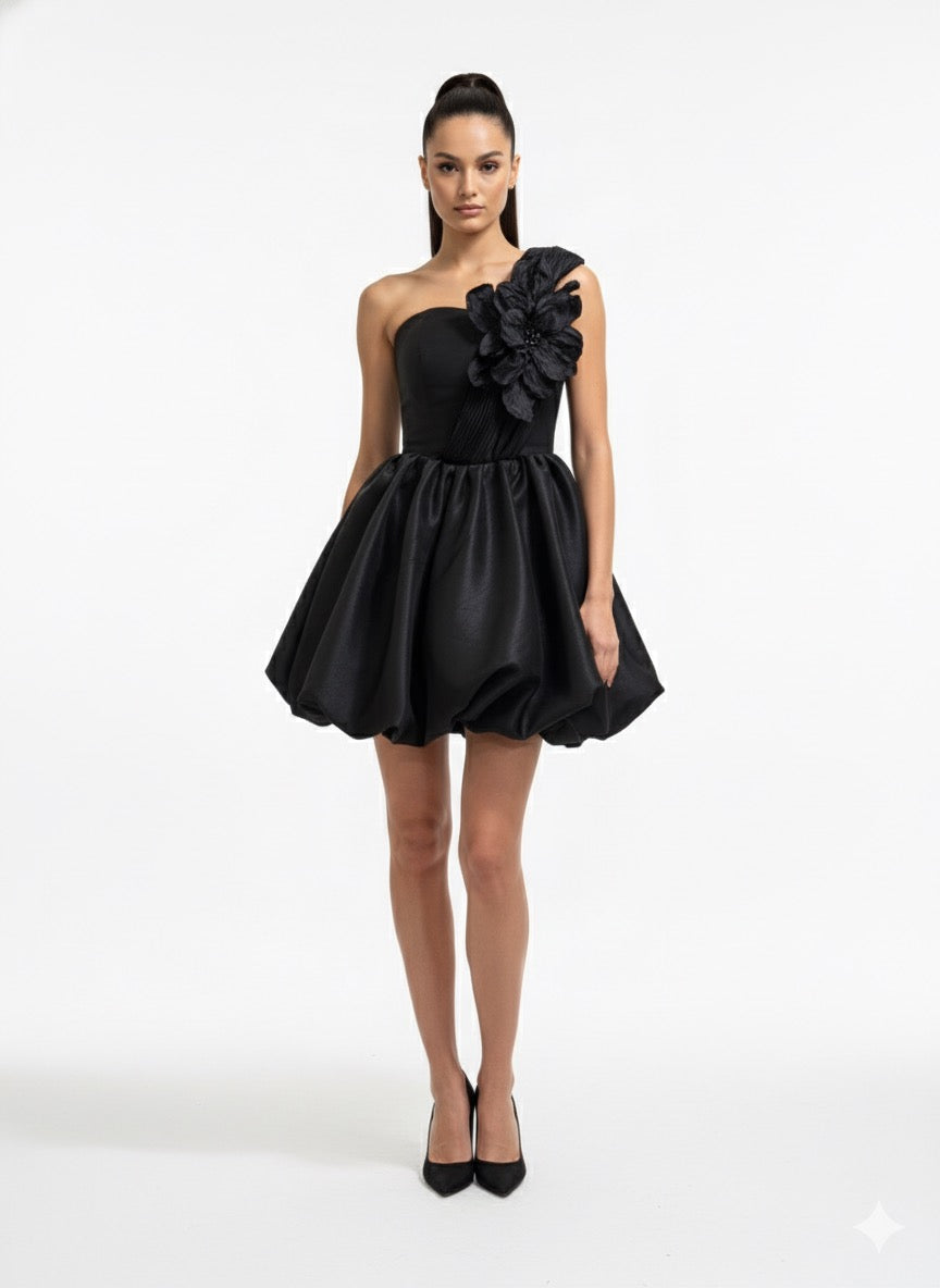 A captivating balance of structure and femininity, this one-shoulder mini dress is crafted from luxurious satin fabric with a soft sheen. The sculpted floral appliqué blooms across the shoulder, adding dramatic texture and artistic flair. The voluminous bubble skirt enhances movement, while the fitted bodice flatters the waist and neckline. Designed for evening elegance, it’s a statement piece that embodies bold sophistication and timeless allure.