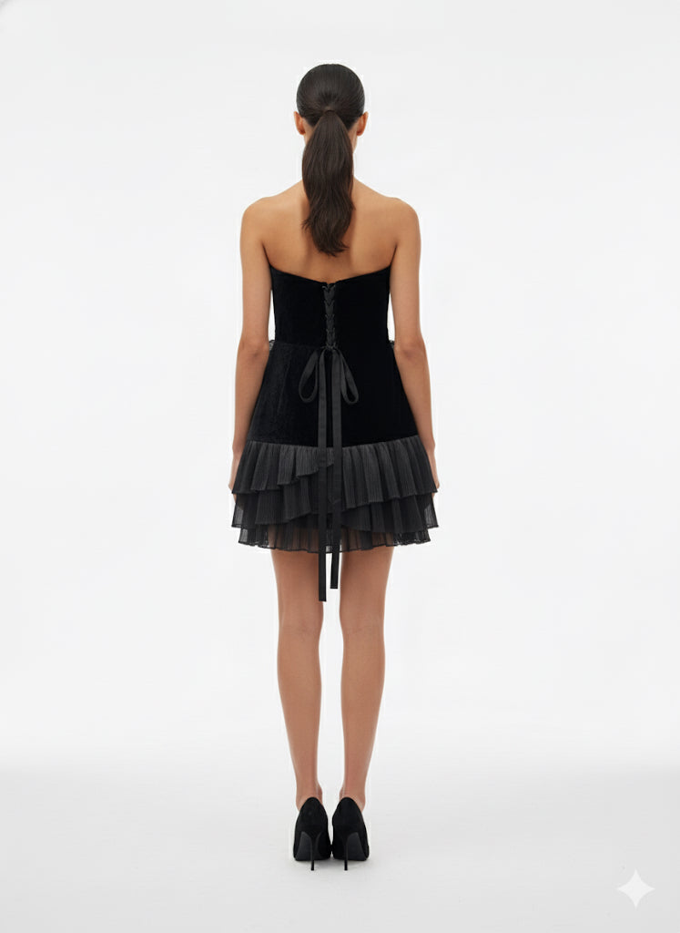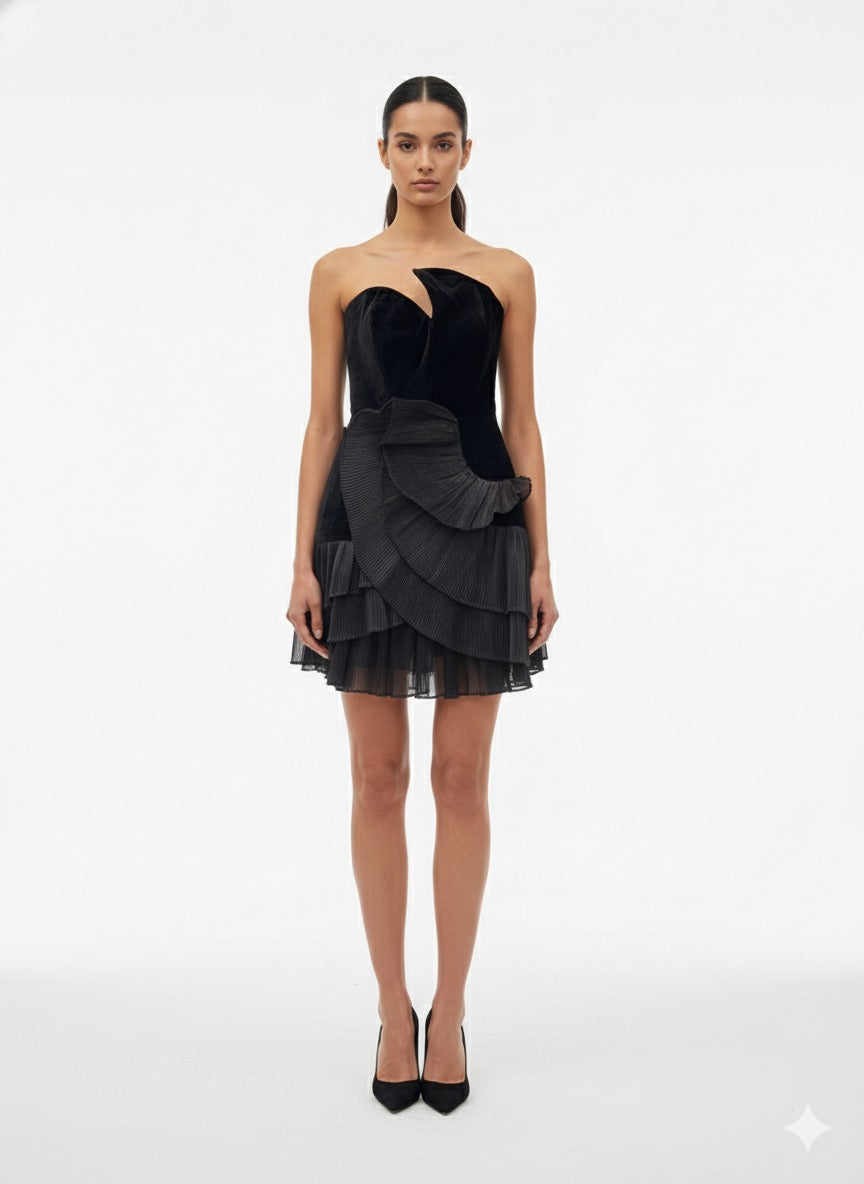 A statement piece of sculptural elegance, this black strapless mini dress is crafted from luxurious velvet and layered with architectural pleated ruffles. The asymmetrical neckline and artfully draped ruffle detail create a dynamic silhouette that celebrates femininity and strength. The voluminous layered skirt adds graceful movement, making it perfect for cocktail events or glamorous evenings. Designed to captivate from every angle, it embodies modern sophistication with a couture-inspired finish.