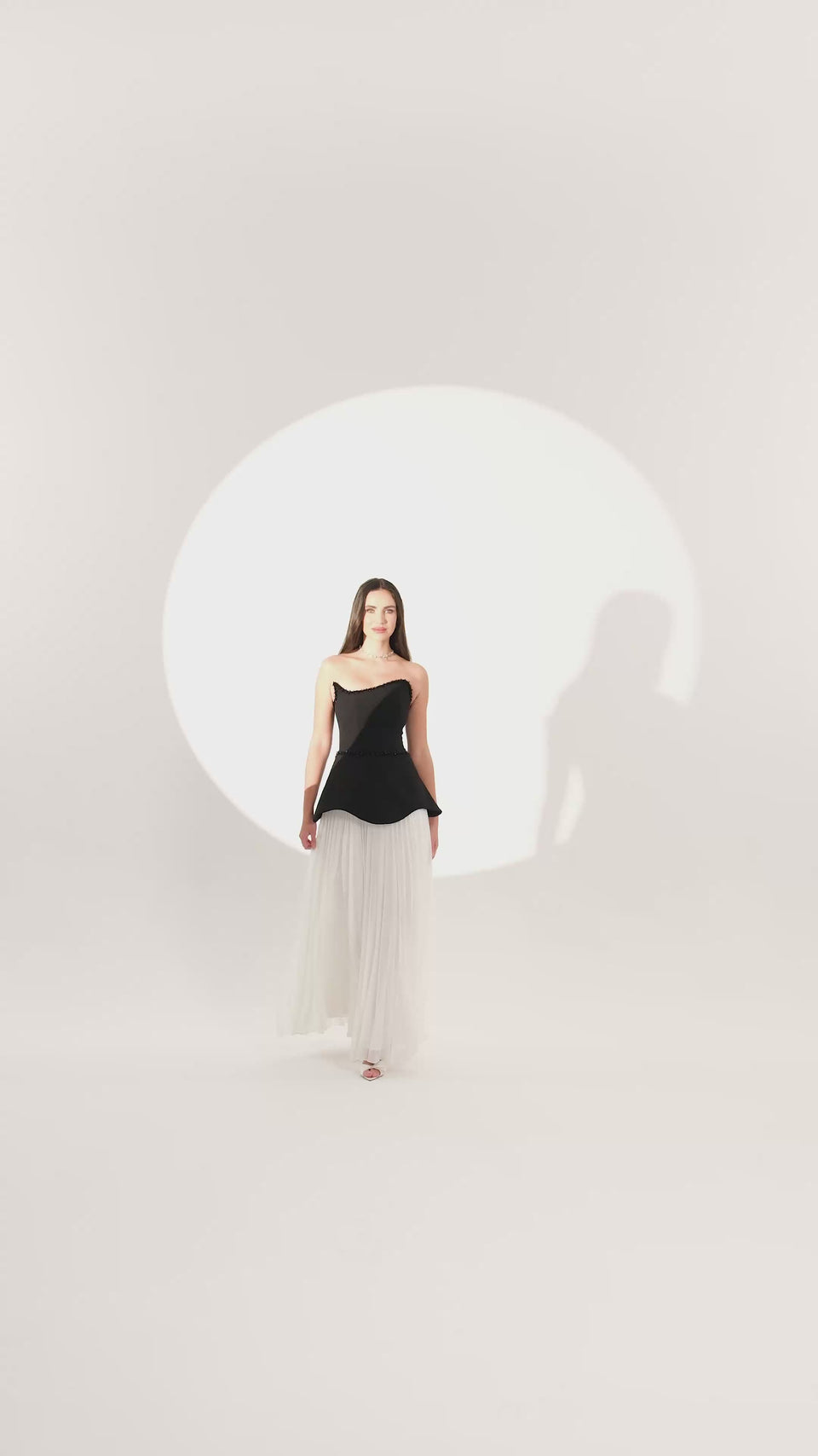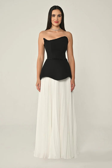 Fitted black bodice with delicate beaded trim at neckline and waist
