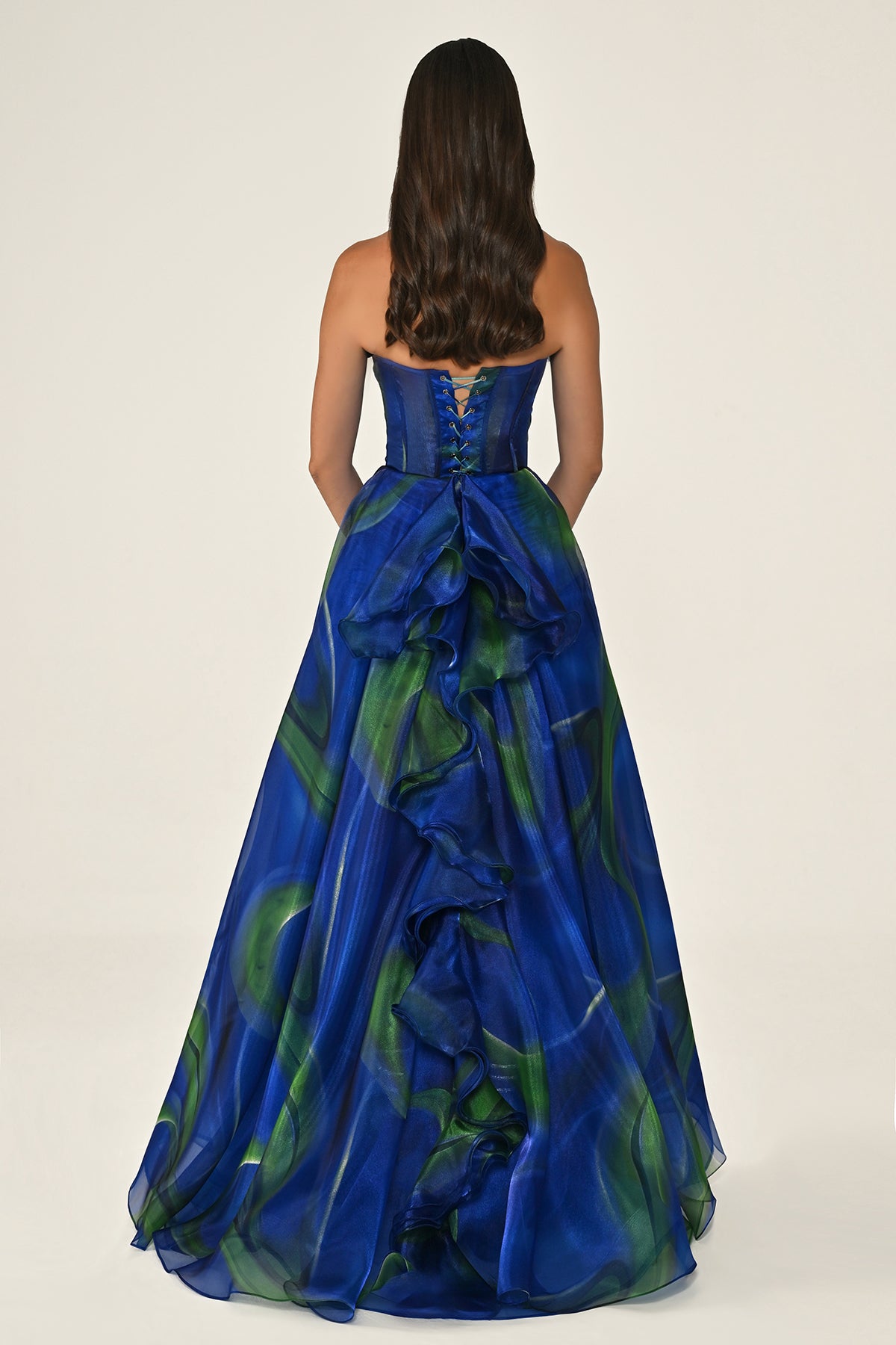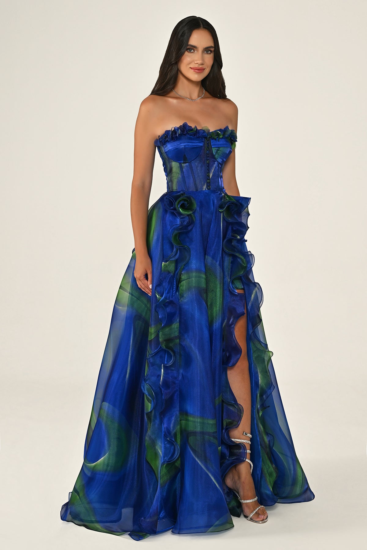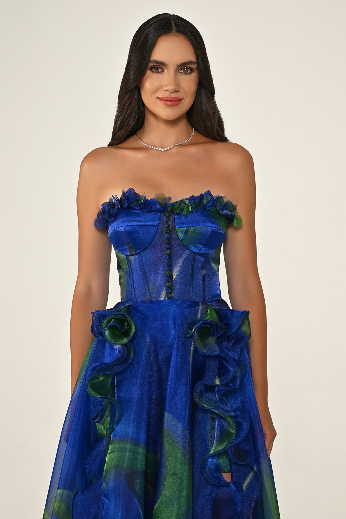 Strapless gown with structured corset bodice and floral ruffle neckline