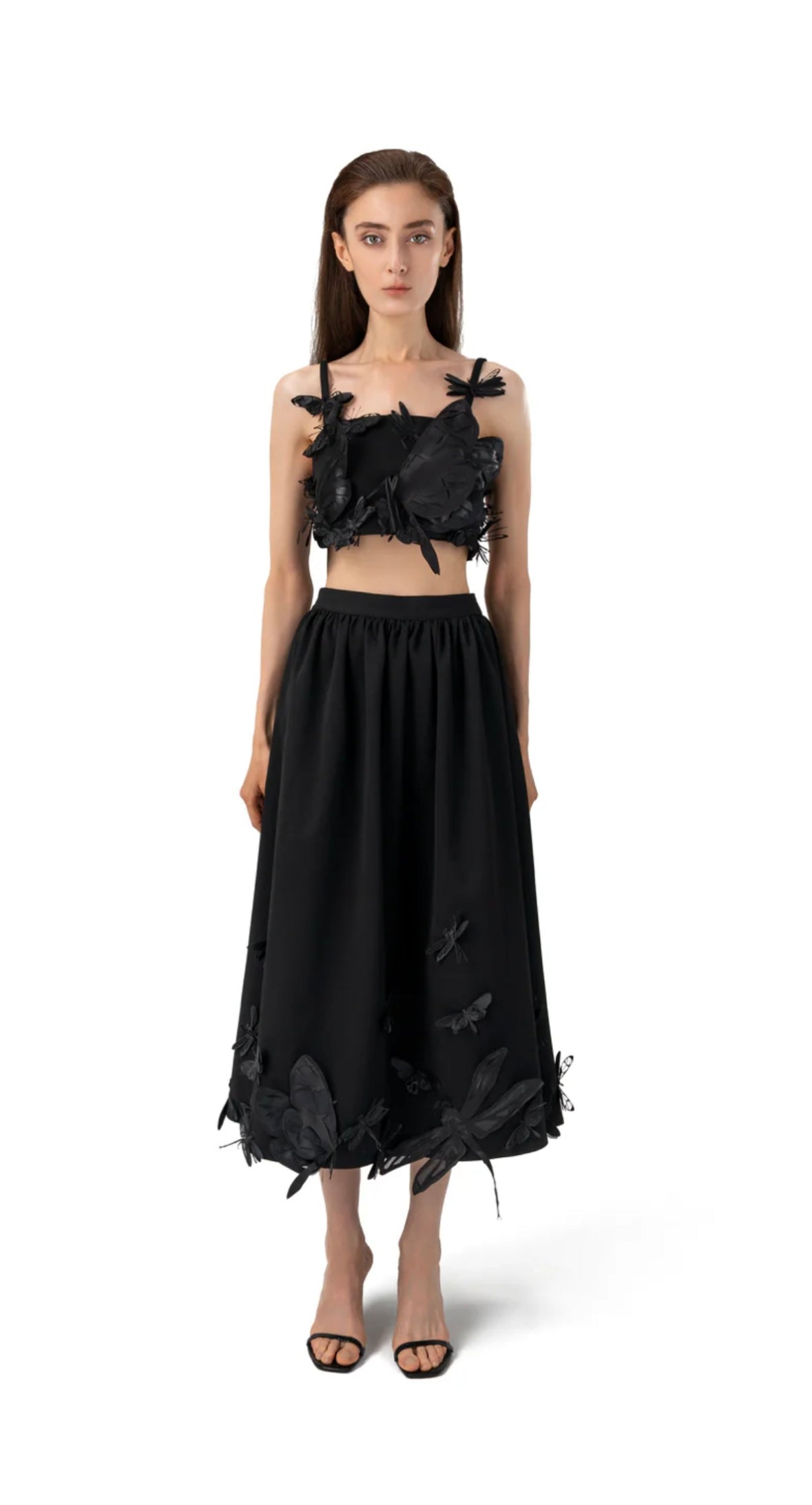 A statement piece that merges artistry and elegance, this black midi skirt captivates with its exquisite 3D butterfly appliqués delicately hand-stitched along the hemline. Crafted from a smooth, structured fabric, the skirt falls gracefully below the knee, creating a sophisticated silhouette that moves beautifully with every step. Designed with a fitted waist and subtle volume, it embodies a perfect balance of drama and refinement—ideal for evening events or elevated daywear.