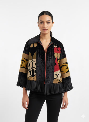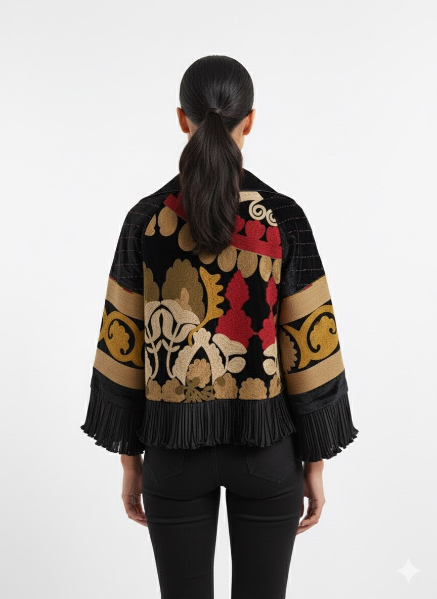 • Rich black velvet base with bold golden, red, and beige embroidered motifs