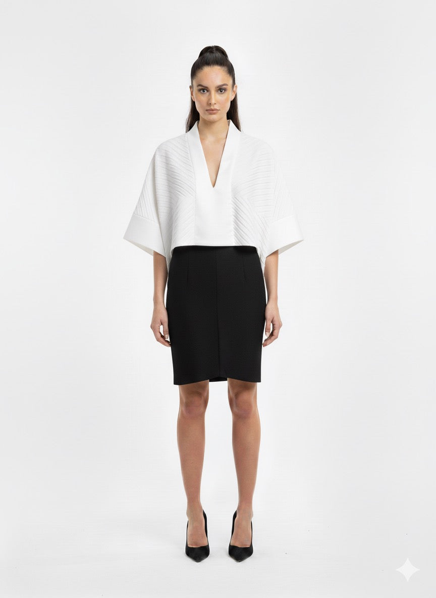 This white structured blouse features a modern architectural silhouette with wide kimono-style sleeves and a sharp V-neckline. The geometric pleat detailing adds depth and elegance, while the cropped cut brings a contemporary edge. Perfectly balancing minimalism and sophistication, it can be styled effortlessly with skirts, trousers, or tailored shorts.