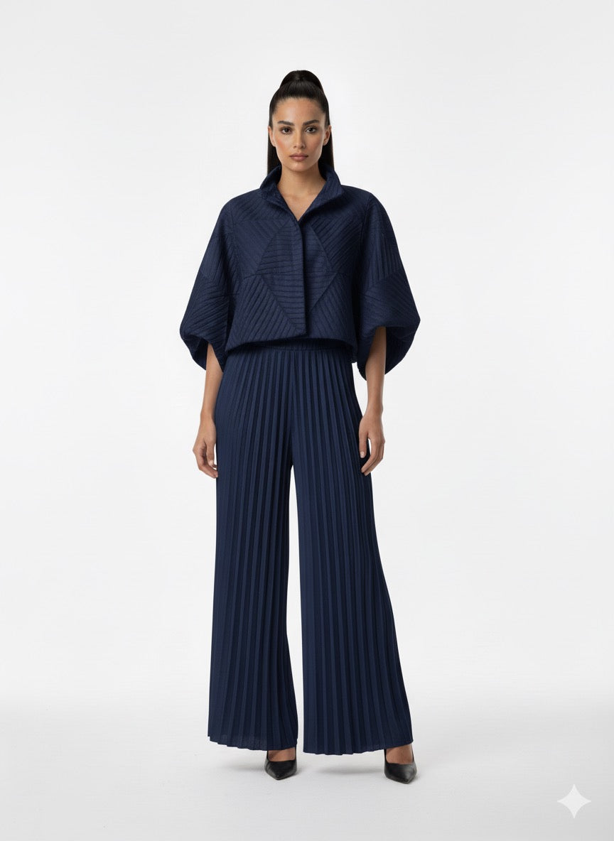 This structured pleated blouse in deep navy blue combines modern architecture with minimal elegance. The wide batwing sleeves and geometric pleating details create a sculptural silhouette that’s both bold and sophisticated. Featuring a short, boxy cut with a subtle collar, it pairs perfectly with high-waisted pants or skirts for an effortlessly elevated look.