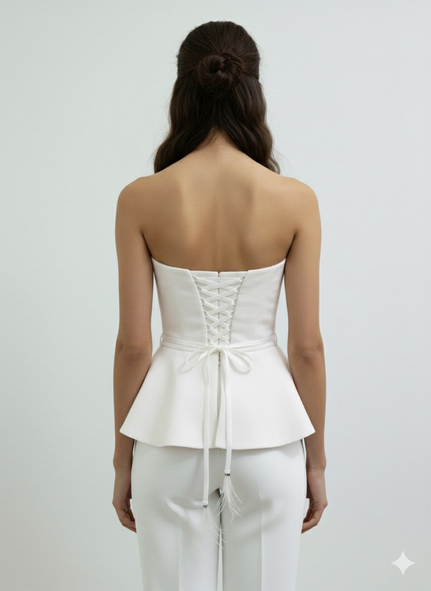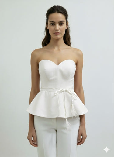 This strapless white bustier top features a sculpted sweetheart neckline and a flattering peplum hem. The waist is cinched with a tie belt finished with tassel details, adding elegance and definition. A versatile piece that pairs beautifully with tailored trousers or skirts for both daytime chic and evening sophistication.