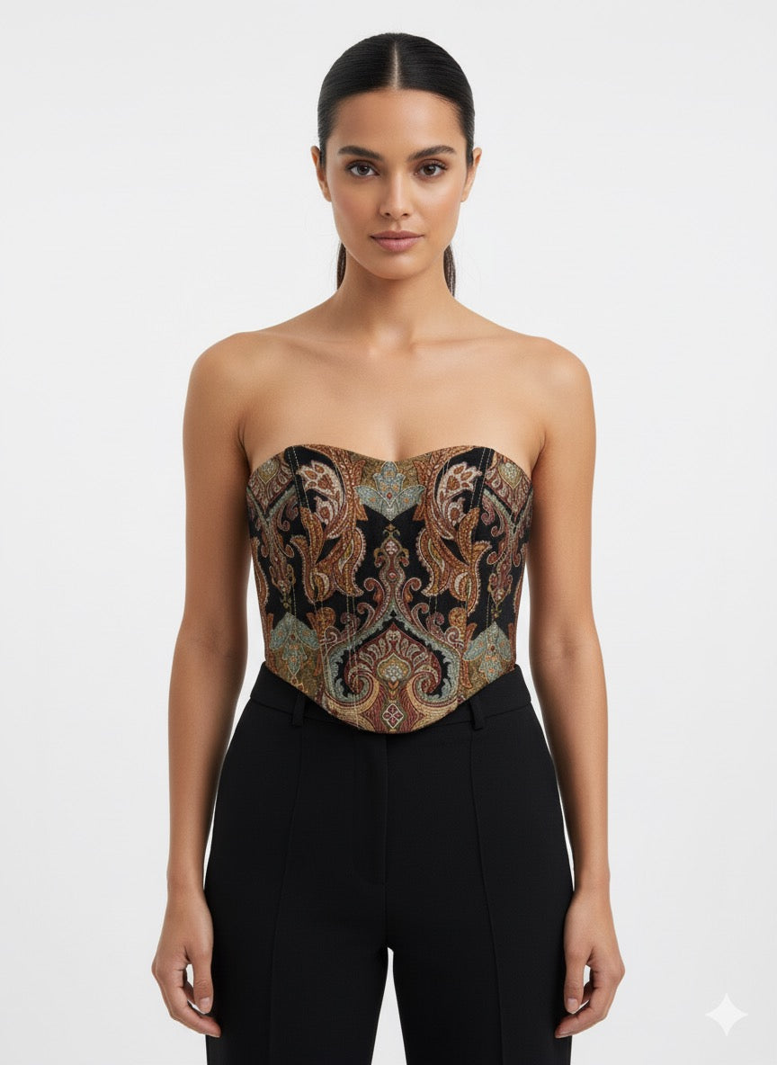 This baroque-inspired jacquard corset top is a bold yet elegant statement piece. Designed with a structured sweetheart neckline, it beautifully contours the silhouette while showcasing an ornate vintage tapestry pattern in rich tones of black, bronze, and turquoise. The metallic thread detailing adds a subtle shimmer, making it perfect for evening events, special occasions, or pairing with high-waisted trousers for a sophisticated modern look.