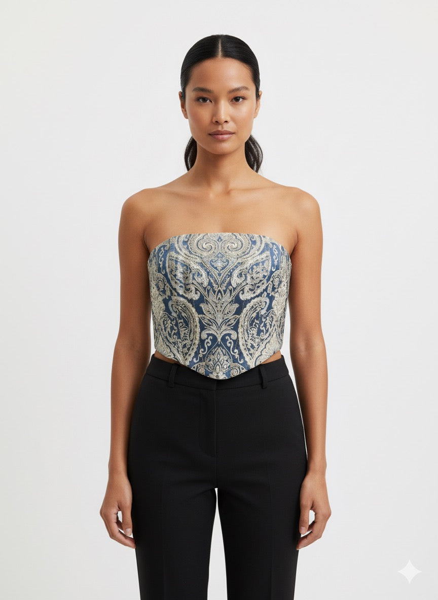 - Strapless brocade corset top in navy blue with intricate paisley motifs