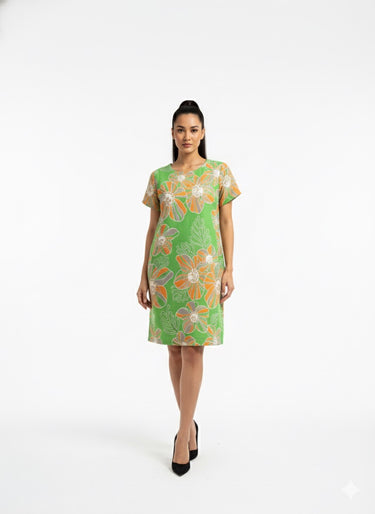 This vibrant green dress brings a fresh and artistic touch to a classic silhouette. Featuring a relaxed straight cut with short sleeves, it is adorned with an expressive floral print that blends soft orange, white, and botanical tones for a lively yet refined look. The lightweight fabric and effortless shape make it ideal for warm days, casual gatherings, or daytime events where comfort meets standout style. An easy statement piece that feels both joyful and polished.