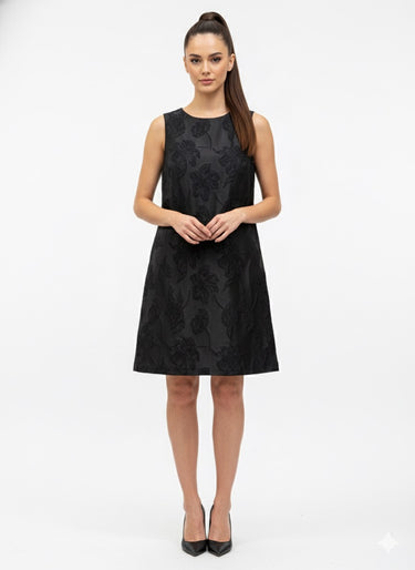 This sleeveless black dress is a refined expression of understated elegance. Designed with a clean A-line silhouette, it features a subtle floral jacquard texture that adds depth and sophistication without overpowering the look. The smooth round neckline and tailored structure create a timeless shape that flatters the body effortlessly. Perfect for evening events, formal gatherings, or elevated daywear, this dress transitions seamlessly from classic to modern styling.