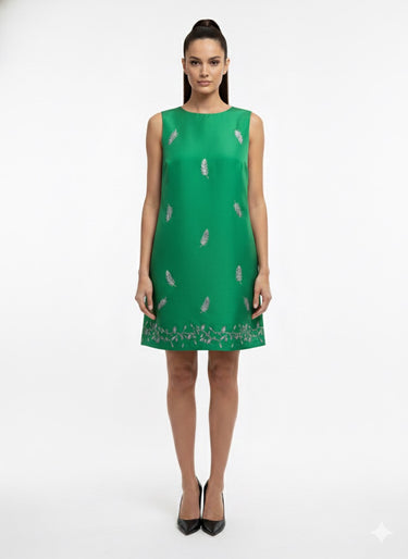 This sleeveless mini dress showcases a vibrant green base accented with delicate embroidered leaf motifs, creating a fresh yet refined look. Designed with a classic shift silhouette, it offers a relaxed fit that flatters the figure while ensuring all-day comfort. The subtle embroidery along the hem adds an elegant finishing touch, making this piece ideal for daytime gatherings, garden events, or effortless evening styling.