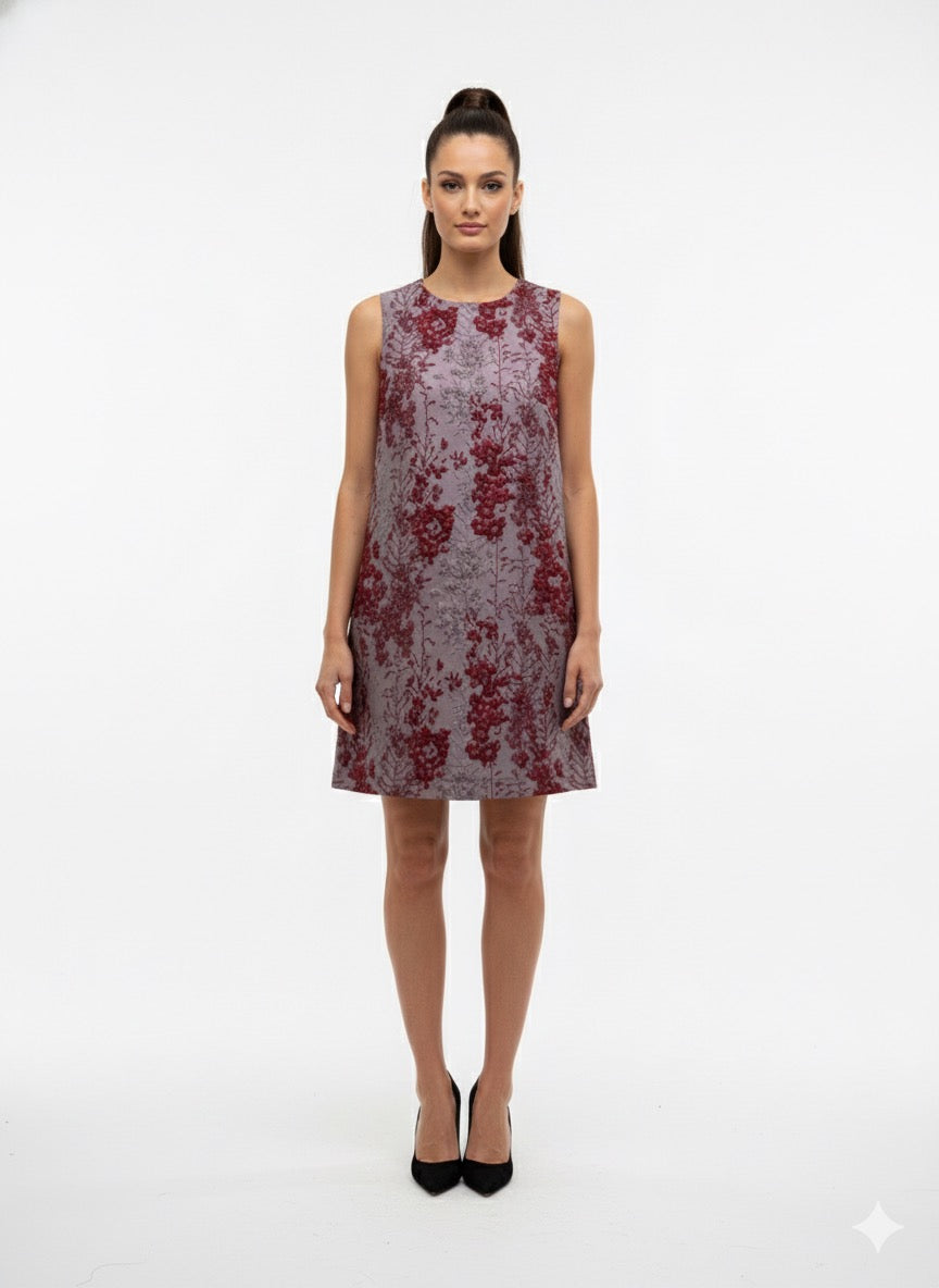 This sleeveless mini dress features an elegant floral jacquard pattern in deep burgundy tones layered over a soft muted base. Designed with a clean round neckline and a classic A-line silhouette, it offers a structured yet comfortable fit that flatters the body without being restrictive. The textured fabric adds depth and sophistication, making this dress ideal for evening occasions, dinners, or polished day-to-night styling.