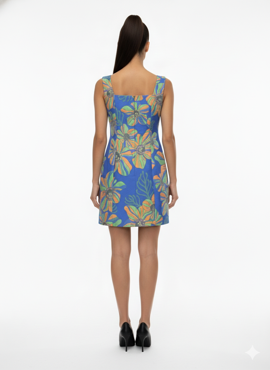 This elegant blue mini dress is crafted from structured taffeta fabric featuring a vibrant floral jacquard pattern. Designed with a clean square neckline and a tailored silhouette, it gently follows the body while maintaining a polished structure. The inner lining ensures comfort and coverage, while the timeless mini length makes it a perfect choice for daytime events or evening occasions. A statement piece that blends playful color with refined elegance.