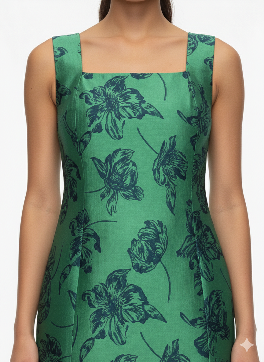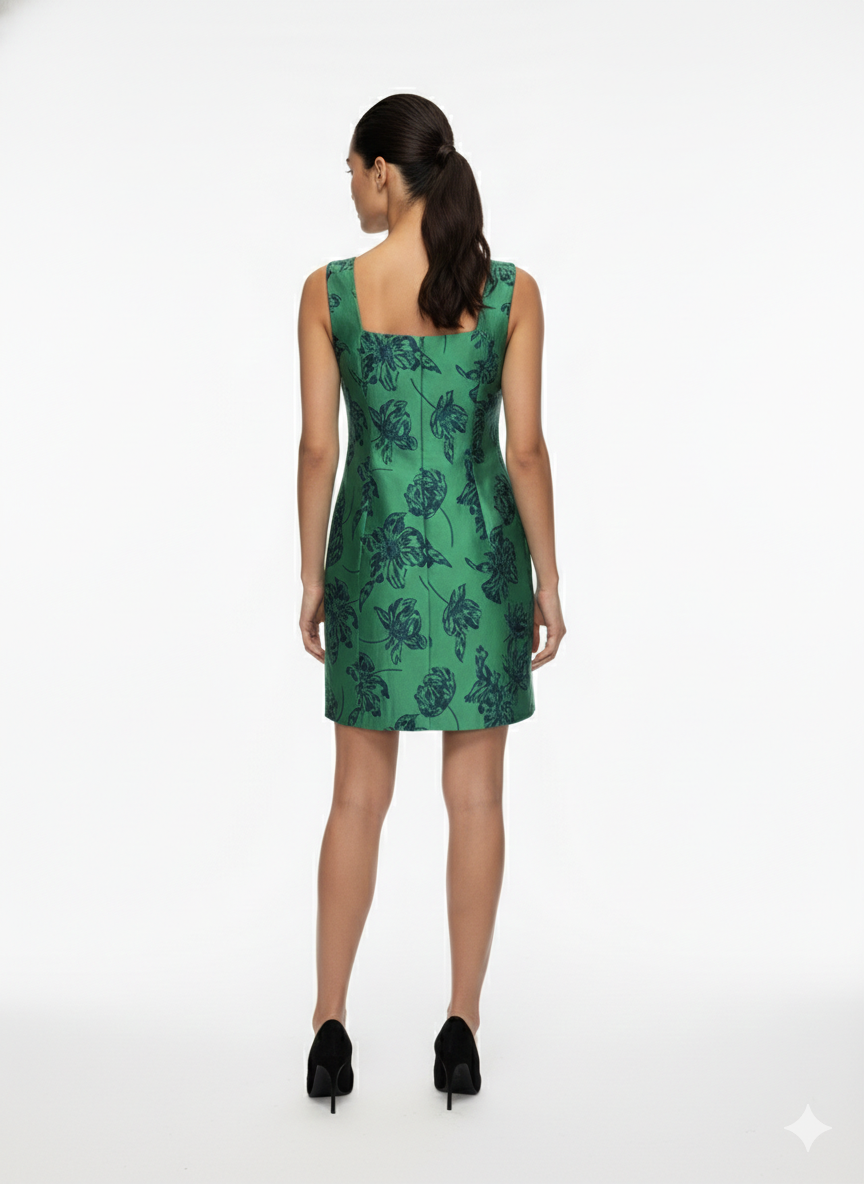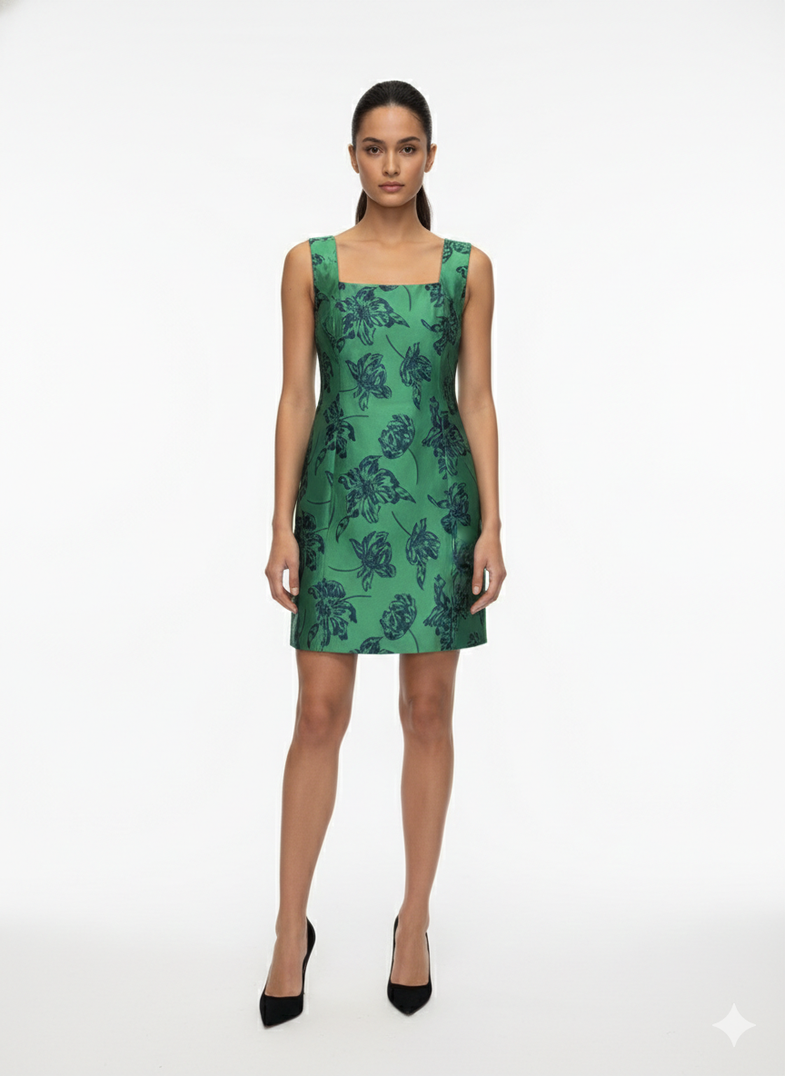 This elegant green mini dress is crafted from structured taffeta fabric featuring a refined floral jacquard pattern. Designed with a clean square neckline and a tailored silhouette, it softly follows the body while maintaining a polished structure. The inner lining provides comfort and coverage, while the timeless cut makes it ideal for both daytime events and evening occasions. A sophisticated piece that blends classic femininity with modern elegance.