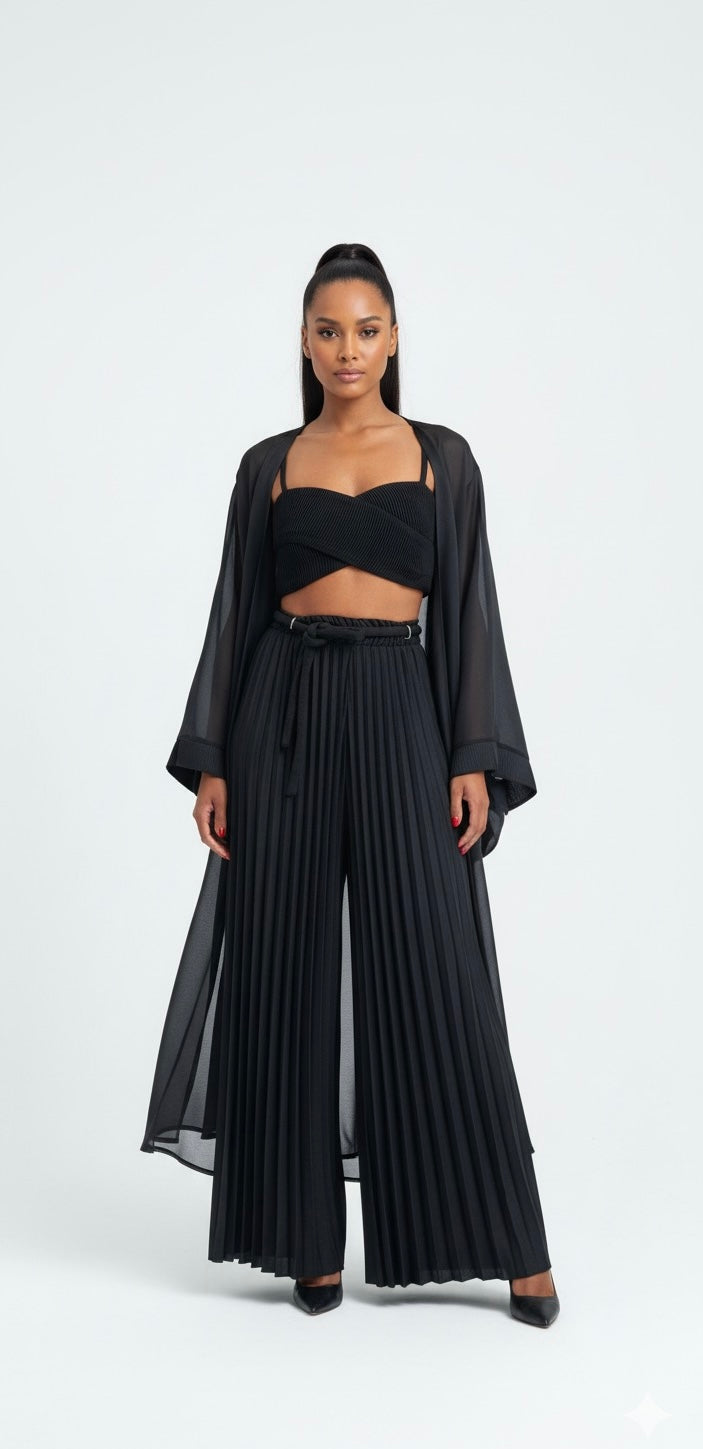 The pants in ZIBOO’s “Midnight Elegance” set are designed to add a touch of sophistication and elegance to any outfit. These high-waisted, wide-leg pleated pants feature a floor-length design that enhances the overall silhouette, creating a graceful, flowing effect with every step. The fine pleats are tailored to provide texture and movement, making these pants a versatile yet standout piece.