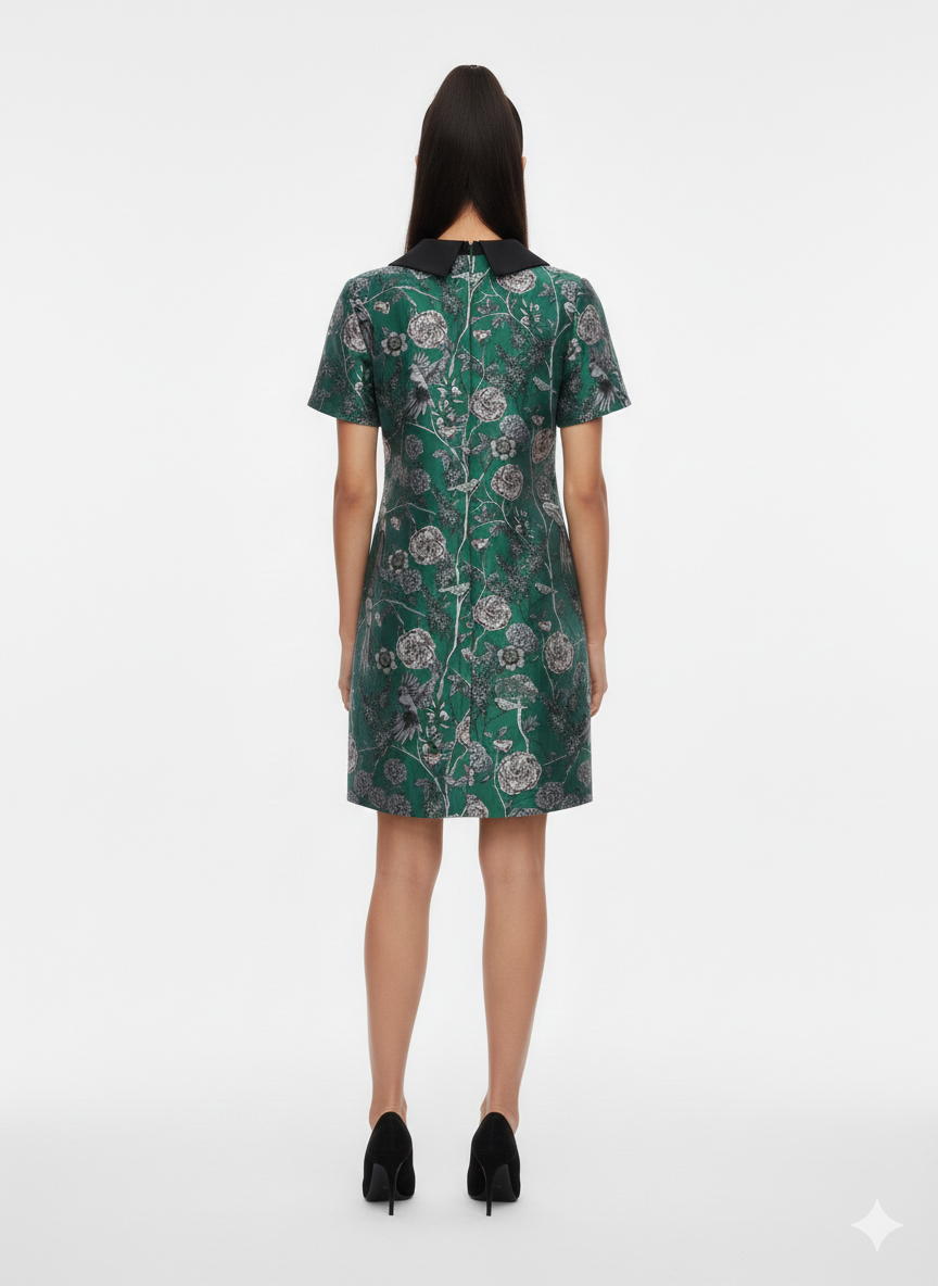 This elegant short-sleeve dress features a clean, structured silhouette with a refined, timeless appeal. Designed with a classic shift shape, it offers a flattering fit that falls effortlessly on the body. The standout contrast collar adds a sharp, modern touch, while the intricate floral-inspired pattern brings depth and character to the design. Perfect for both daytime occasions and elevated gatherings, this dress combines sophistication with understated charm.