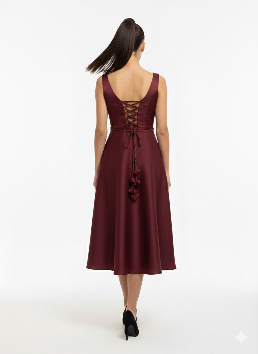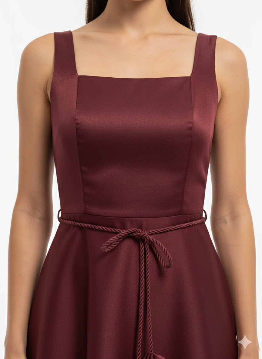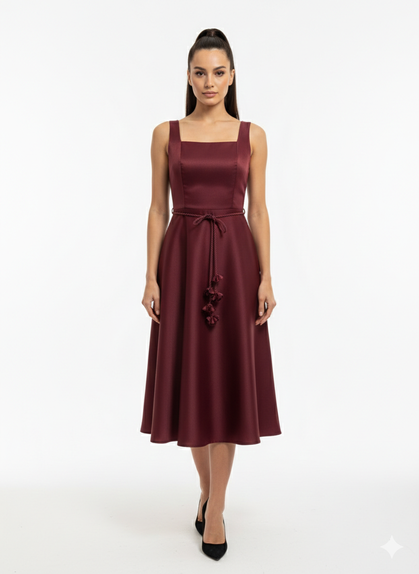 This elegant burgundy midi dress features a clean, structured silhouette with a flattering square neckline and wide shoulder straps. Designed with a fitted bodice and softly flared skirt, it creates a timeless and feminine shape. The waist is defined with a matching fabric tie belt finished with delicate tassel detailing, adding subtle movement and charm. A refined piece that transitions effortlessly from daytime occasions to evening events with classic sophistication.