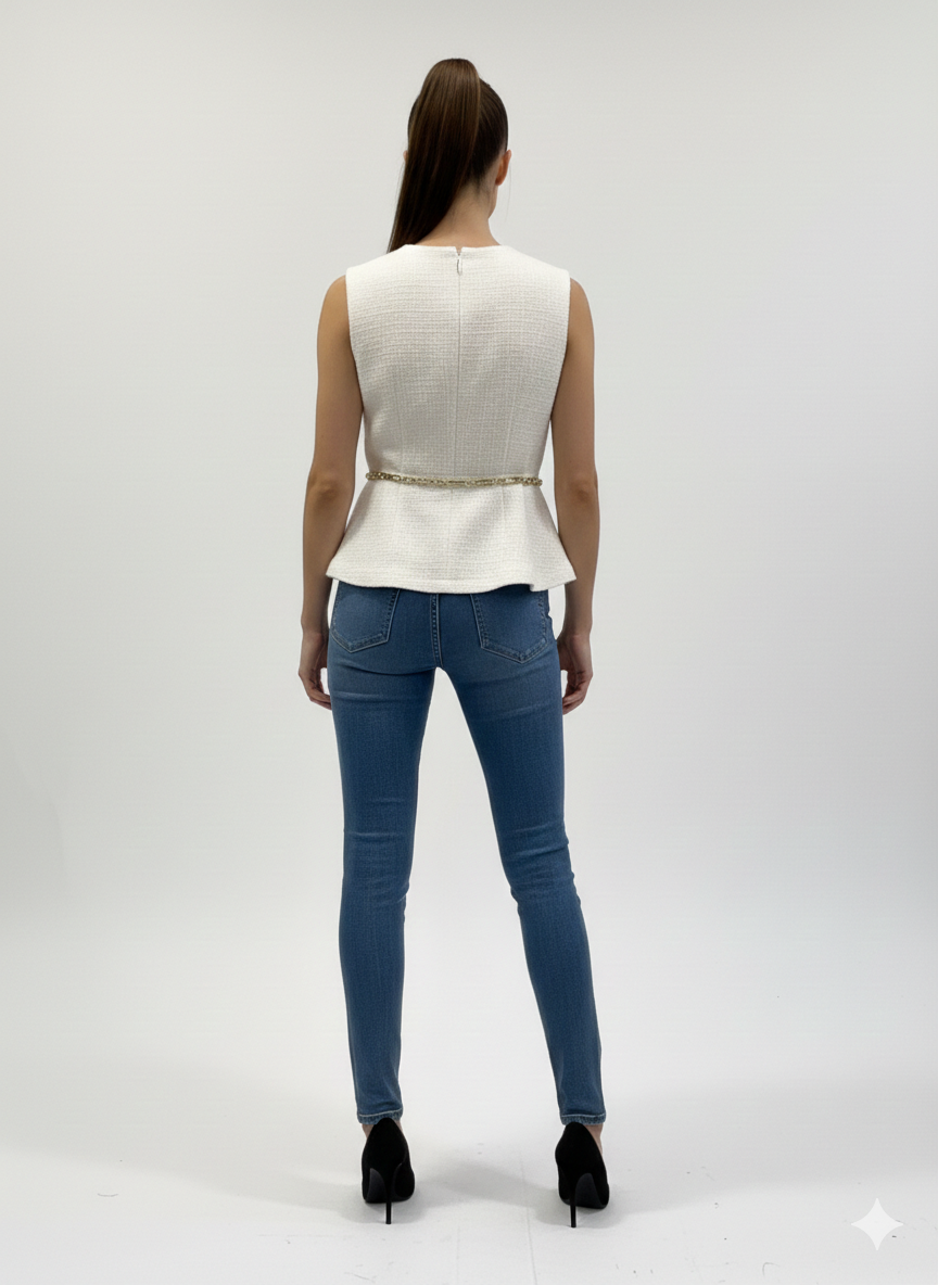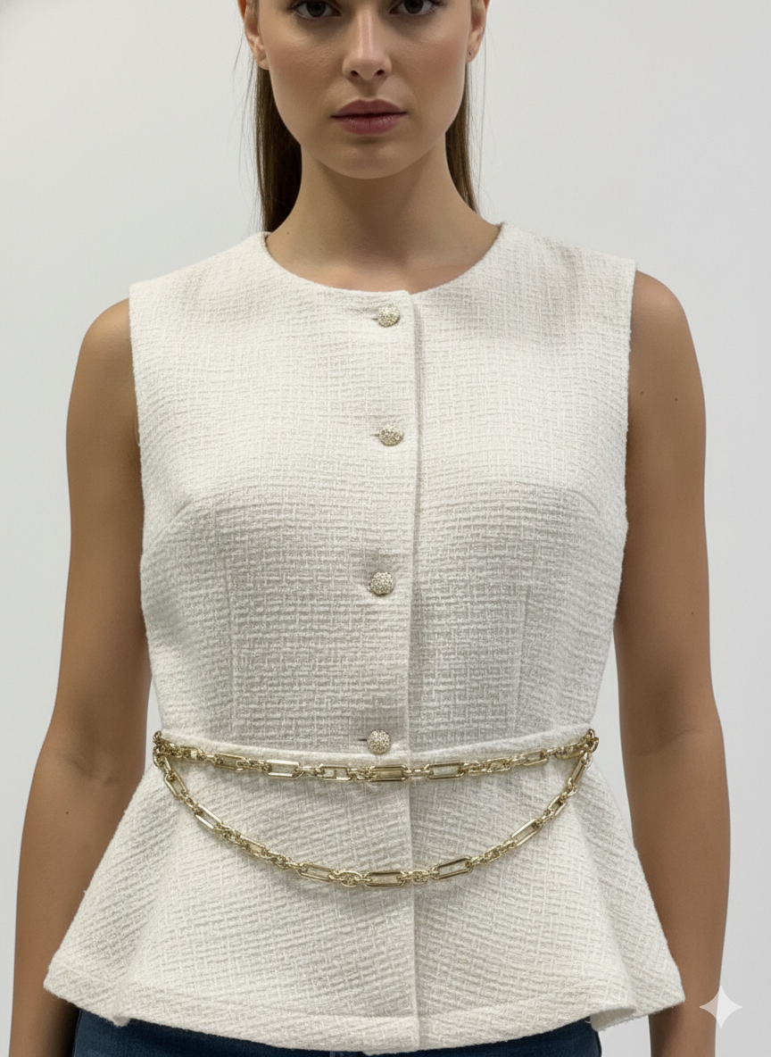 This elegant white sleeveless vest features a refined textured fabric with a structured silhouette that softly flares at the waist for a flattering fit. Designed with a round neckline and delicate front button closure, it is accented with a detachable gold-tone chain belt that highlights the waist and adds a subtle statement touch. The clean front and tailored back create a polished yet versatile piece, perfect for elevating everyday looks or styling for chic daytime and evening outfits.