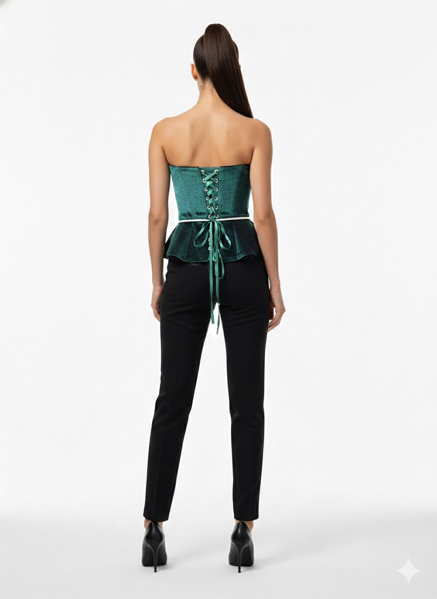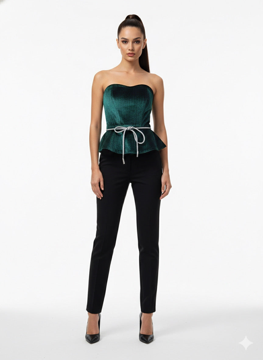 This elegant strapless green velvet top features a sculpted bodice that beautifully highlights the neckline and shoulders. Crafted from rich velvet fabric, it offers a luxurious texture with subtle depth and sheen. The peplum-style hem creates a flattering silhouette, while the delicate rope belt at the waist adds a refined accent and adjustable fit. Designed to elevate evening looks, this piece pairs effortlessly with tailored pants or skirts for a polished, sophisticated finish.