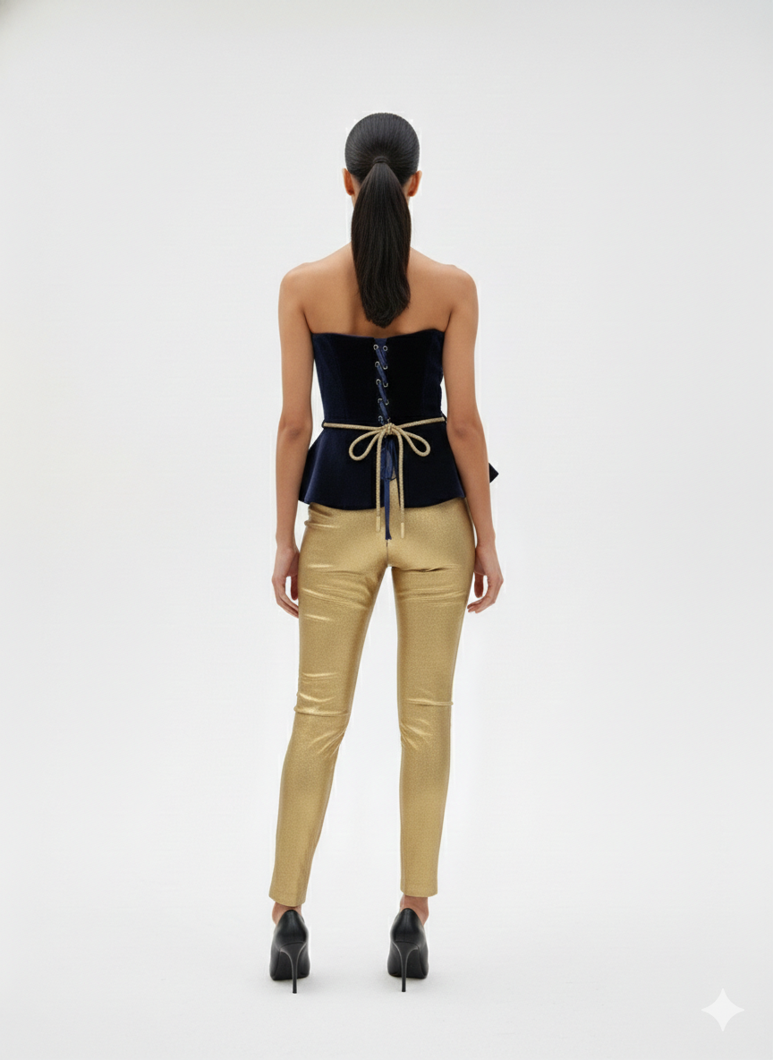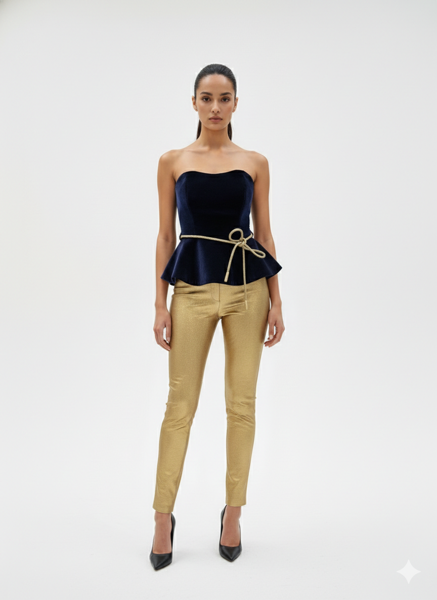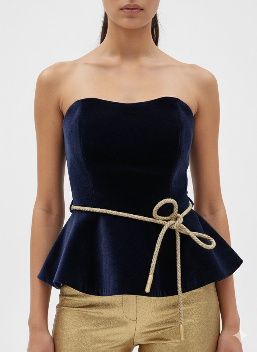 This elegant strapless navy velvet top features a sculpted bodice that beautifully highlights the neckline and shoulders. Crafted from rich velvet fabric, it offers a luxurious texture with subtle depth and sheen. The peplum-style hem creates a flattering silhouette, while the delicate rope belt at the waist adds a refined accent and adjustable fit. Designed to elevate evening looks, this piece pairs effortlessly with tailored pants or skirts for a polished, sophisticated finish.